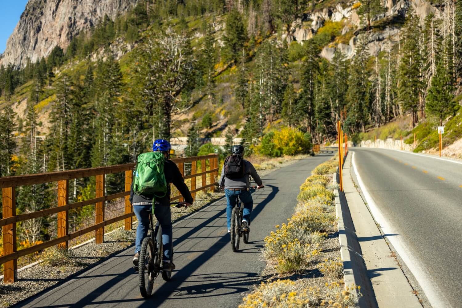 Ease into your cycling adventures with a scenic ride along the Lakes Basin Path, a rewarding 5-mile one-way route that leads from town into Mammoth’s iconic Lakes Basin. Ideal for beginners and e-bike riders, the trail winds past rushing creeks, towering pines, and postcard worthy alpine views. Turn around at Twin Lakes or continue through the forest toward Horseshoe Lake. While the grades are gentle, the ride still packs over 1,000 feet of elevation gain, just enough to feel accomplished.