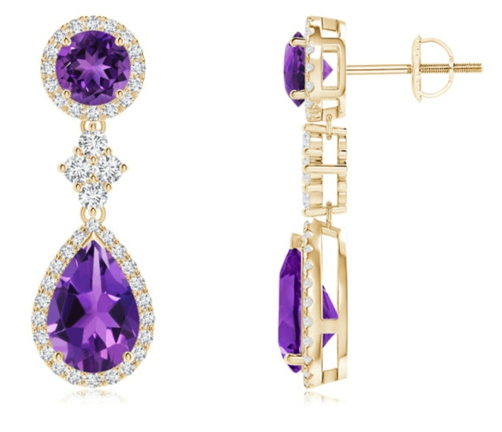 Bold yet deeply feminine, these two tier amethyst drop earrings with a diamond halo from Angara are for the mother who deserves to be seen in her full glory. The rich violet of the amethyst speaks to depth, wisdom, and a love that only grows richer with time, while the diamond halo frames it all in brilliance. For the woman who has always been the most dazzling person in the room.