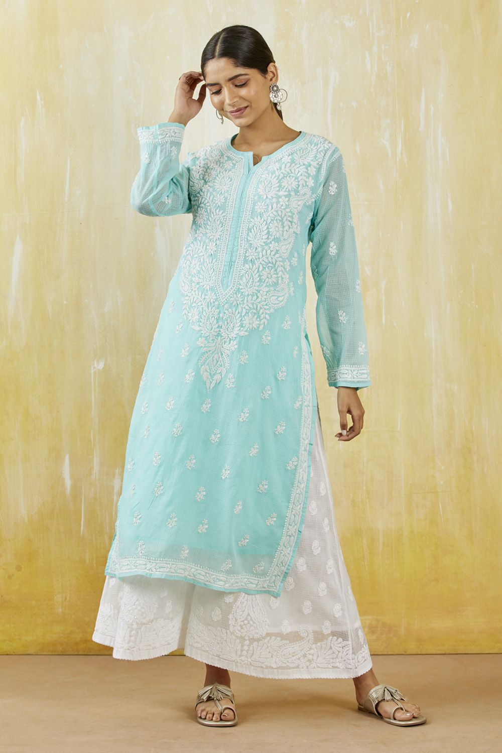 You can buy the kurtas, dupattas, and pants; basically, you can put together a whole look. They are elegant and extremely comfortable to wear and lounge around in all day long. Chikan attires have this unique quality of looking both simple and perfectly dressy at the same time. The color palette comprises gorgeous pastels in yellow, pink, blue which never go out of style. The Chikankarist have long-sleeved kurtas in at least seven different colours and each piece has splendid thread work on them. You can also get chikan anarkalis and pair it with an amazing cotton chikan palazzo to complete the look.