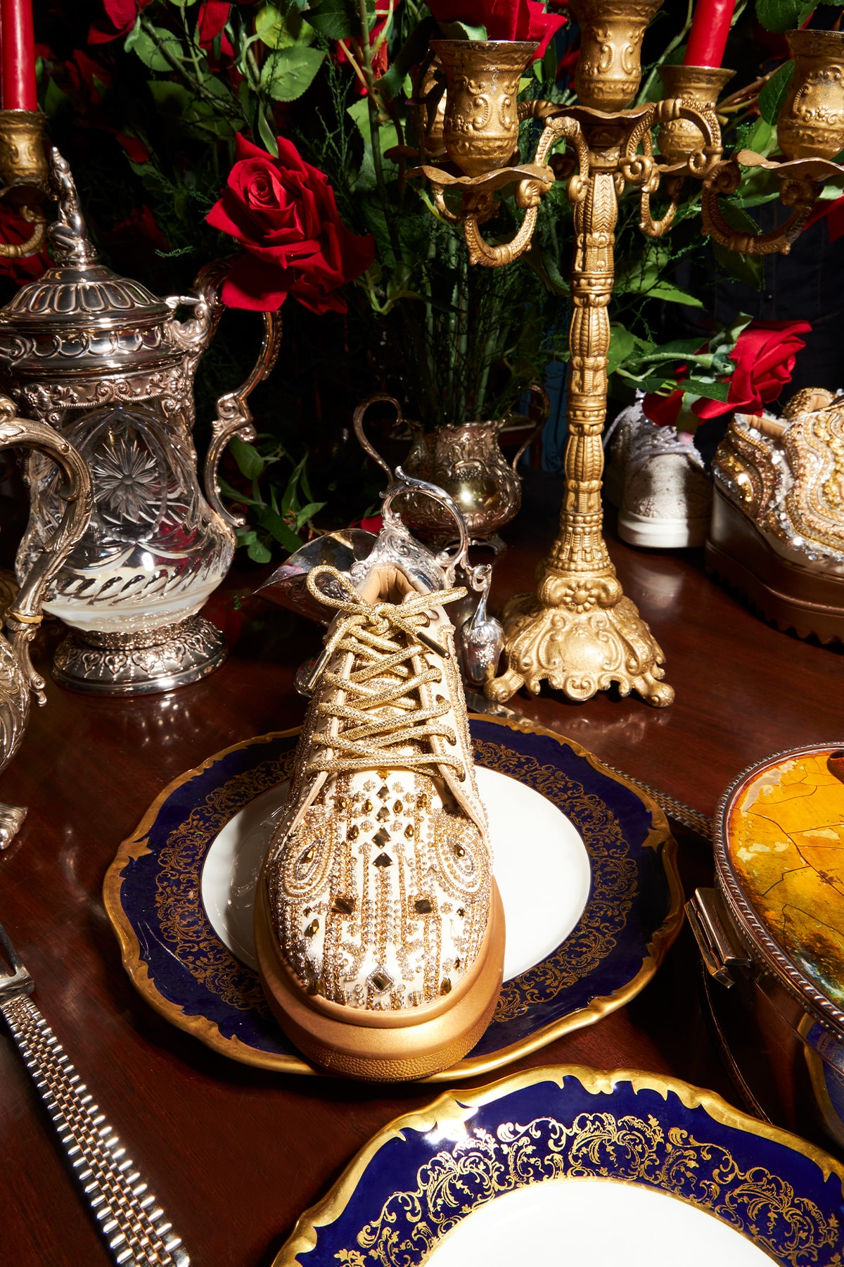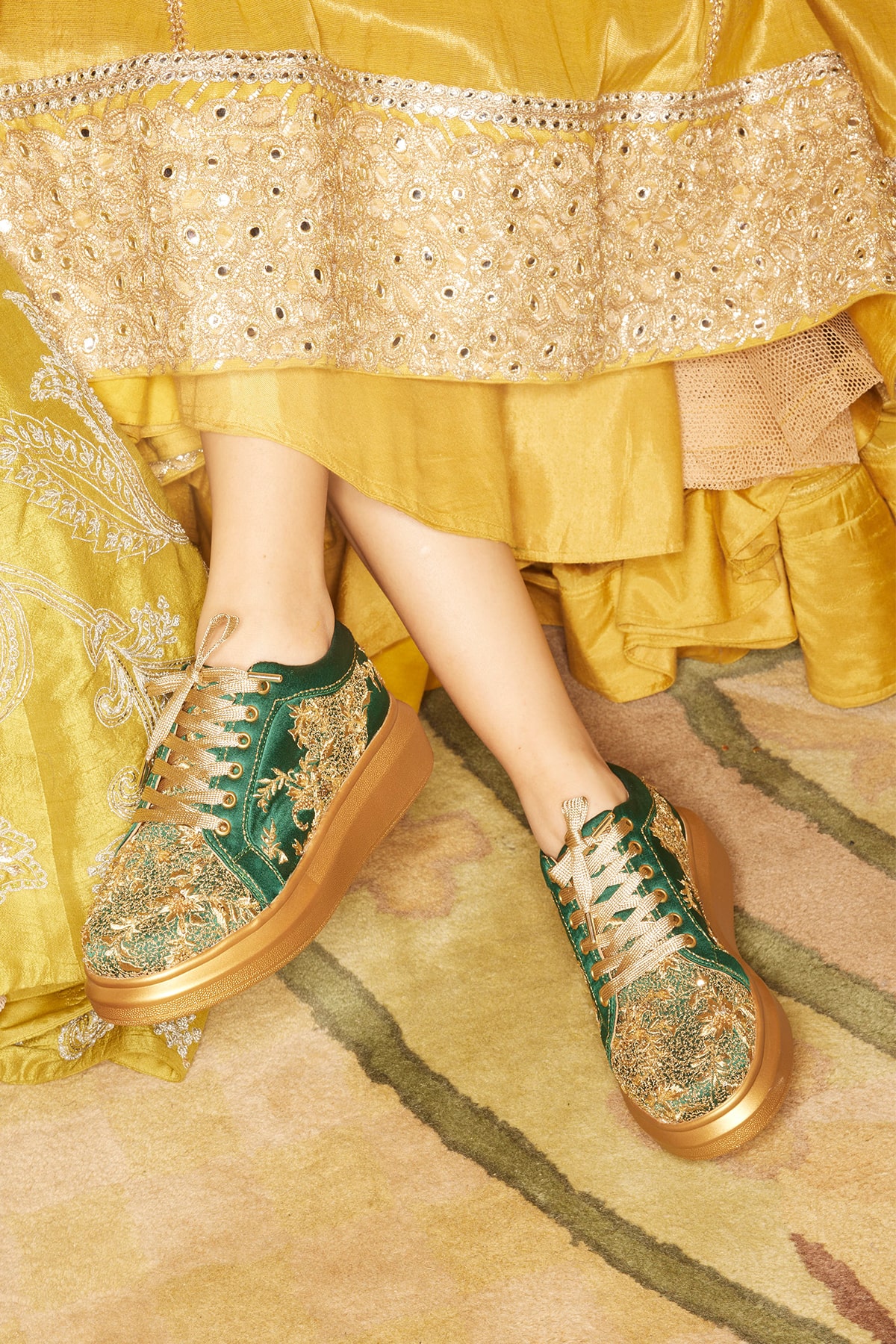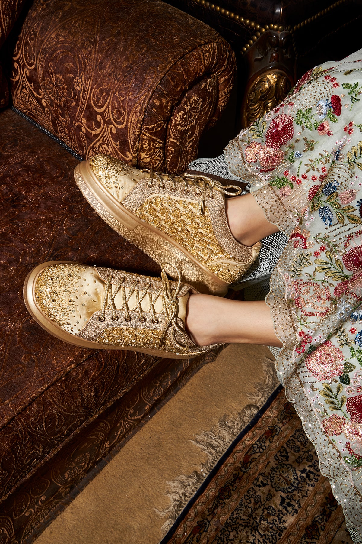 Step into Anaar’s world where classic sneakers like Honeybee and The Empress reign supreme! These kicks aren’t just shoes; they’re a celebration waiting to happen. With Honeybee, it’s like walking on sunshine with its sparkling gota work and mesmerizing embroidery. Made from satin, they redefine luxury. Prefer something subtler? Meet The Empress, balancing festivity with casual charm flawlessly. Its brocade work is pure art, while the dabka pitta and hand-cut bead embellishments scream party-ready. Even the soles and laces shine in gold! So, slip into Anaar’s creations, and let your feet do the talking – after all, who needs a crown when you’ve got these royal sneakers?