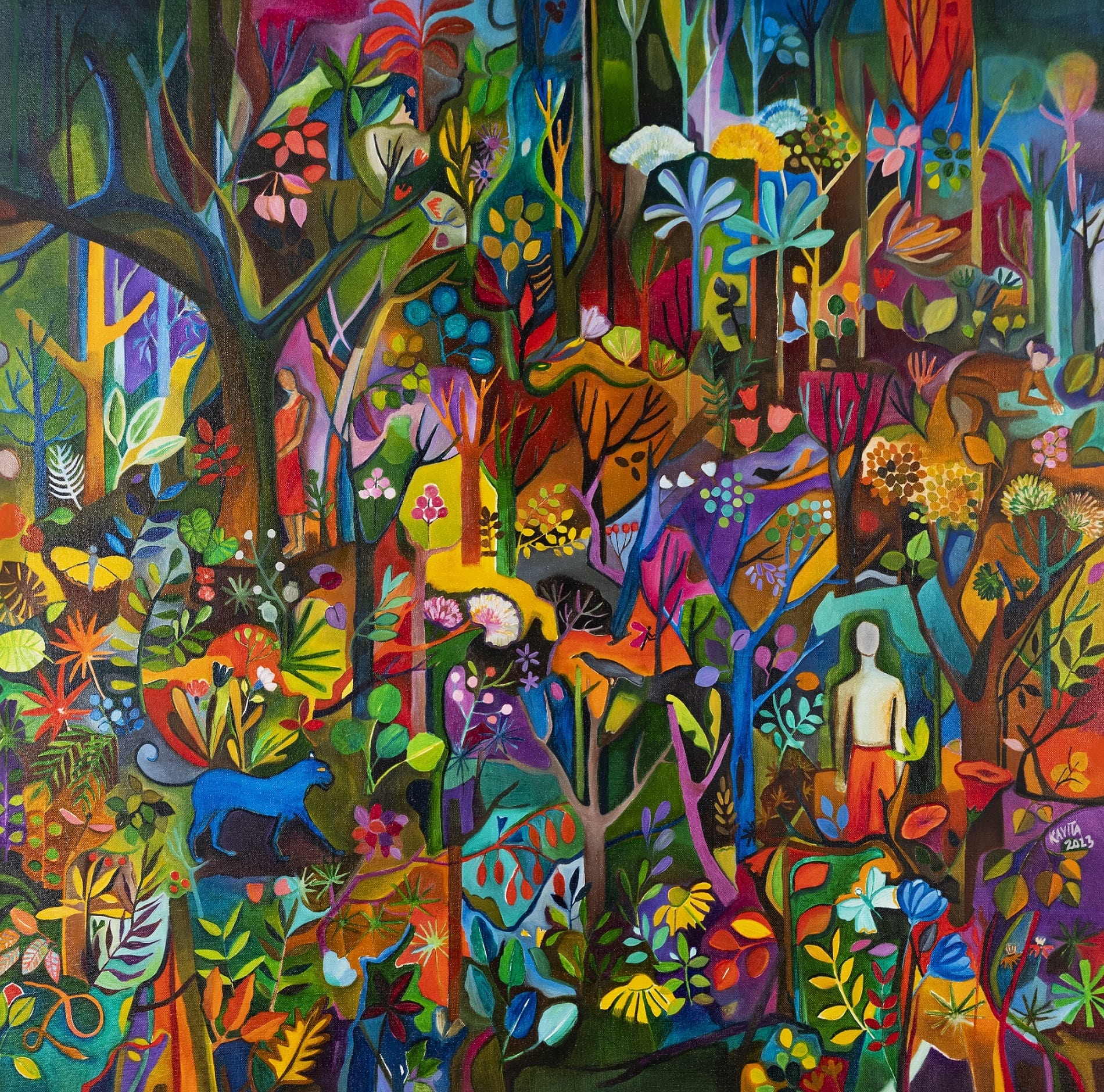 The exhibition showcases Kavita’s recent works rendered in oil on canvas. The works are mesmerising evocations of the plenitude of forests and the people who live there in natural harmony. The experience of forests was an integral part of Kavita’s growing up years in Gomia, Jharkhand surrounded as it was by forests, river and hills. Inspired by the memories of the town, Kavita made a photobook on Gomia, and this exhibition is her tribute to the forests which were an integral part of her childhood. Kavita’s art carries the rhythms of her own life and the deeper rhythms of nature, of the mother earth in its glorious profusion, a profusion that holds humanity in its embrace whether one chooses to believe or not, and sings the song of enchantment.