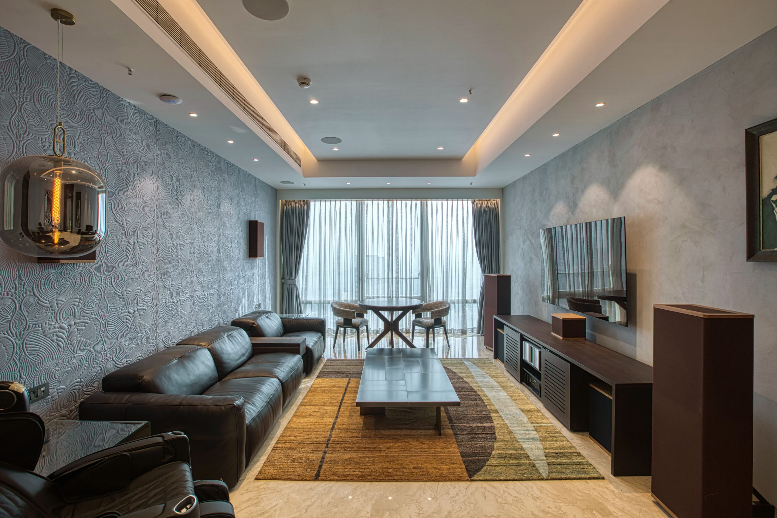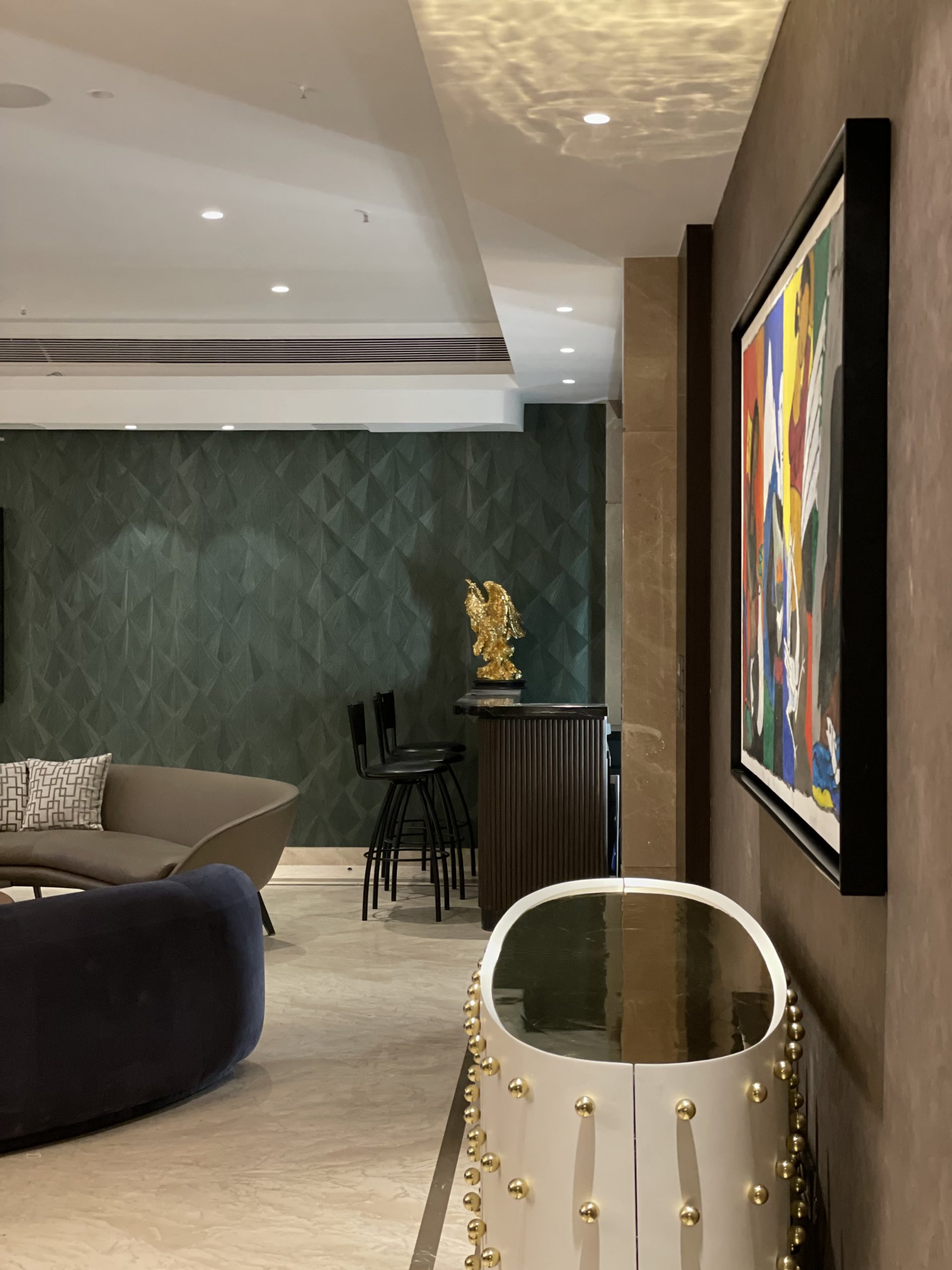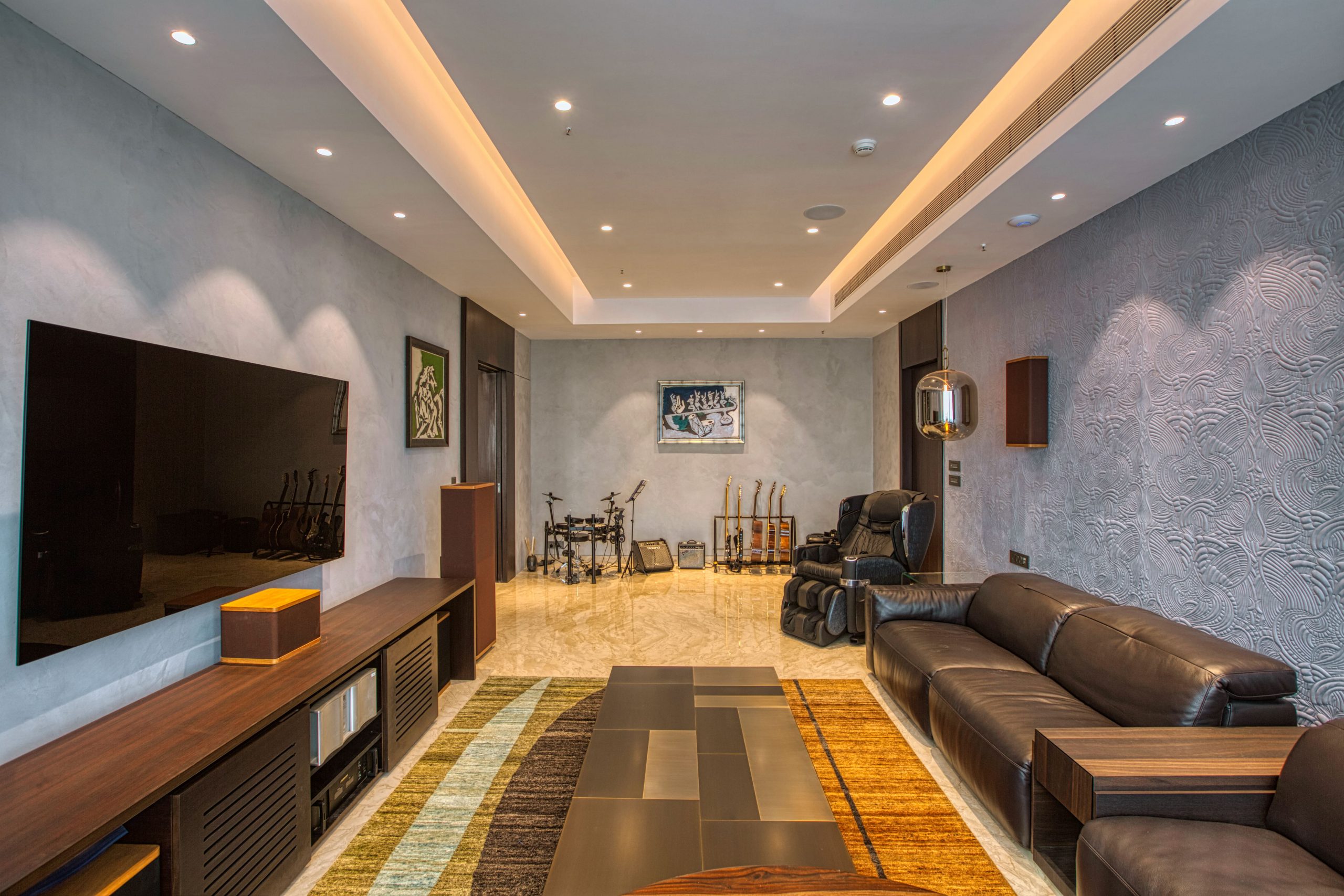 Be attentive to unique preferences or requirements that your client may have, and incorporate tailored solutions to accommodate them. For instance, in Madhuri’s home, a den with a collection of musical instruments enables impromptu performances. This space is backdropped with softly textured wallpaper to balance acoustics. Such dedicated spaces also contribute to celebrating the occupants’ talents and interests daily.