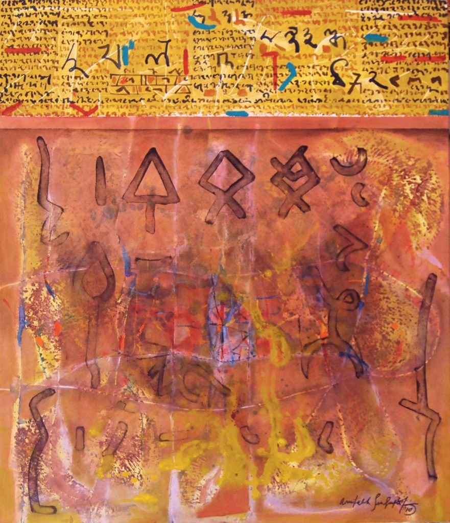 Critic Uma Nair lauds Sengupta, stating, “Sengupta is both intellect as well as aesthete of a rare order. His most important collector in India is the distinguished Kiran Nadar, who acquired his work in 2005 at Taj Mansingh in Delhi.” According to Nair, Sengupta’s oeuvre is deeply rooted in his observations of antiquity, featuring influences from rock paintings, pyramidal wonders, and hieroglyphics. His works embody a balance between stunning figurative studies and abstract art, offering art lovers a spectrum of experiences. Nair adds, “We can imagine the beauty and power of ancient scripts through his textured terrains, which evoke sunrises and sunsets in subtle, resonant shades.”