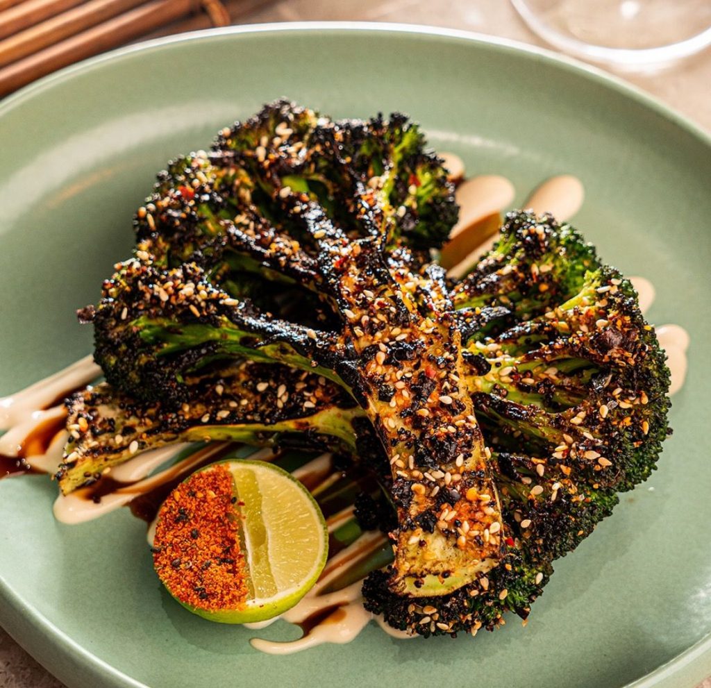 Charred broccoli with lemon tahini sauce garnished with furikake.