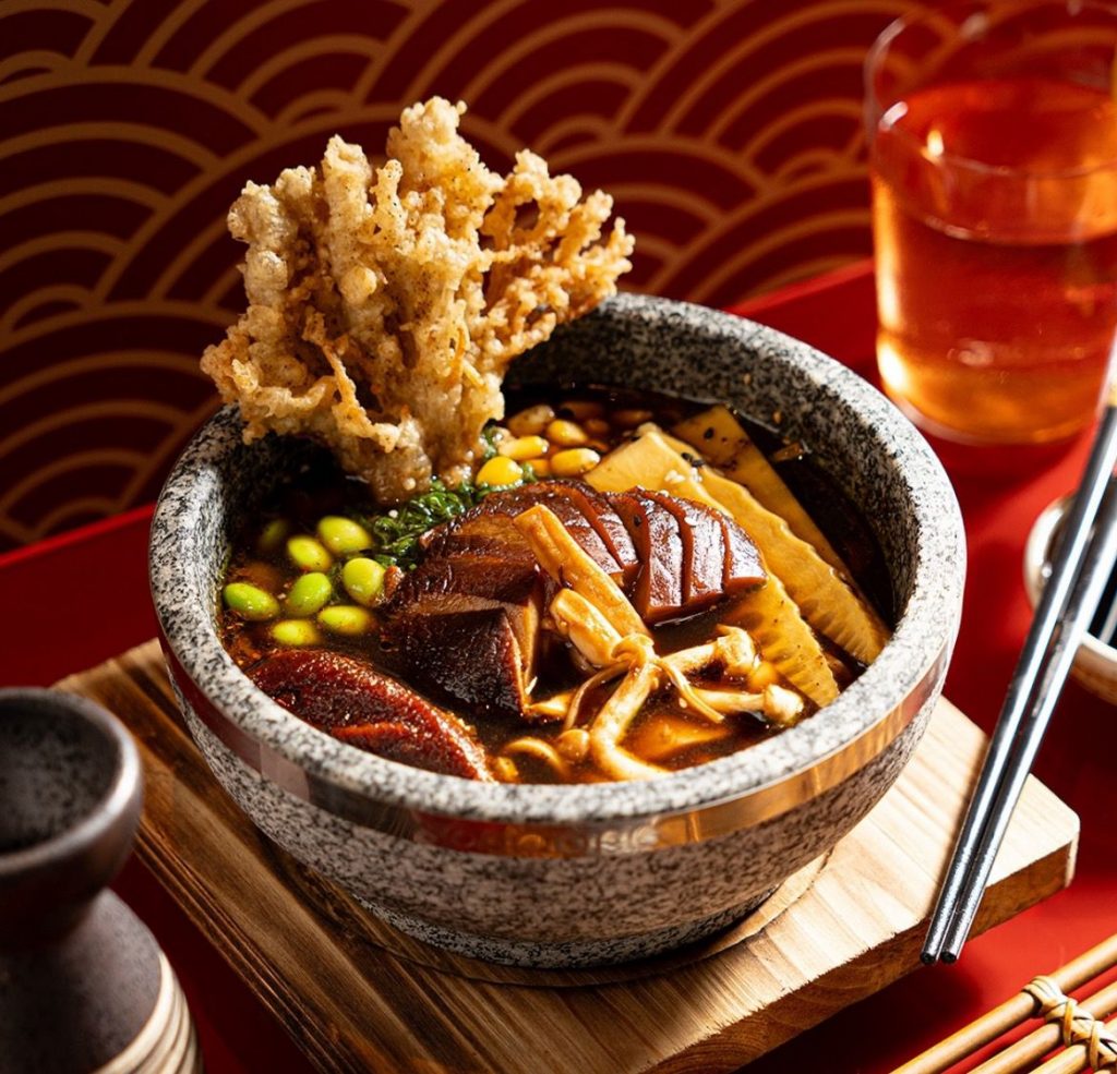 Assorted mushroom,noodles,bamboo shoot,edamame,corn, chilli bomb,mushroom broth finished with spring onion oil,truffle oil,black garlic oil garnish with spring onion & sesame seed
