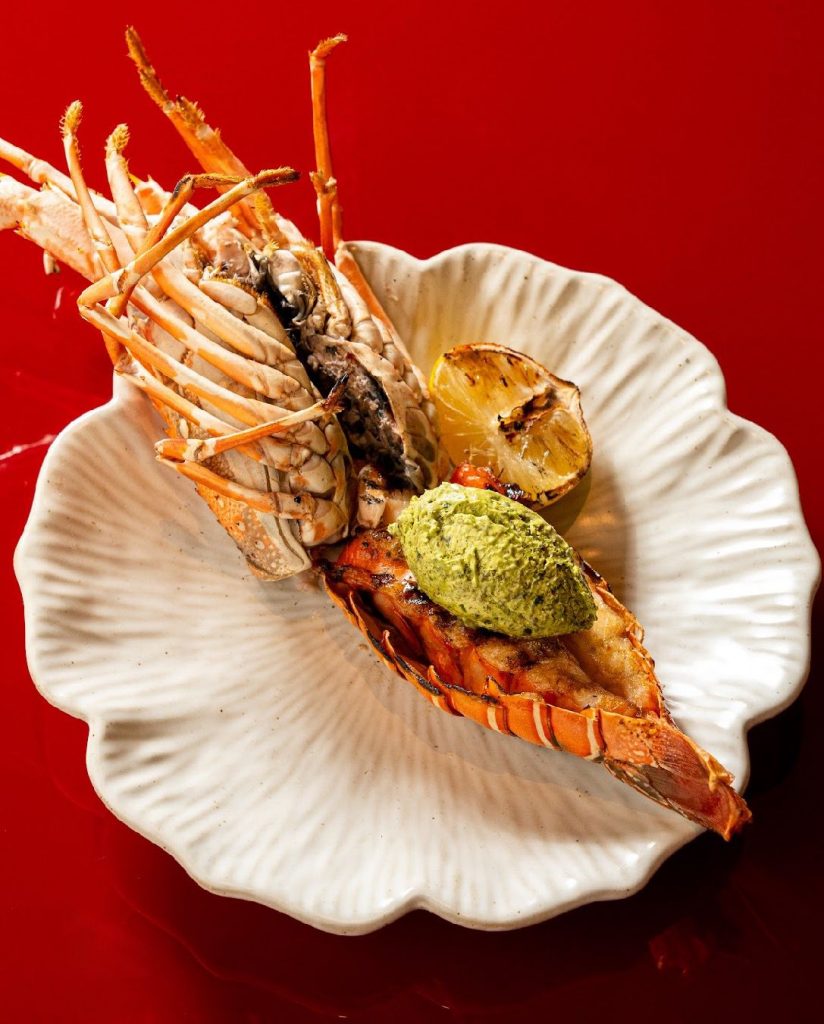 Grilled lobster with herbed seaweed butter served with charred italian lemon.
