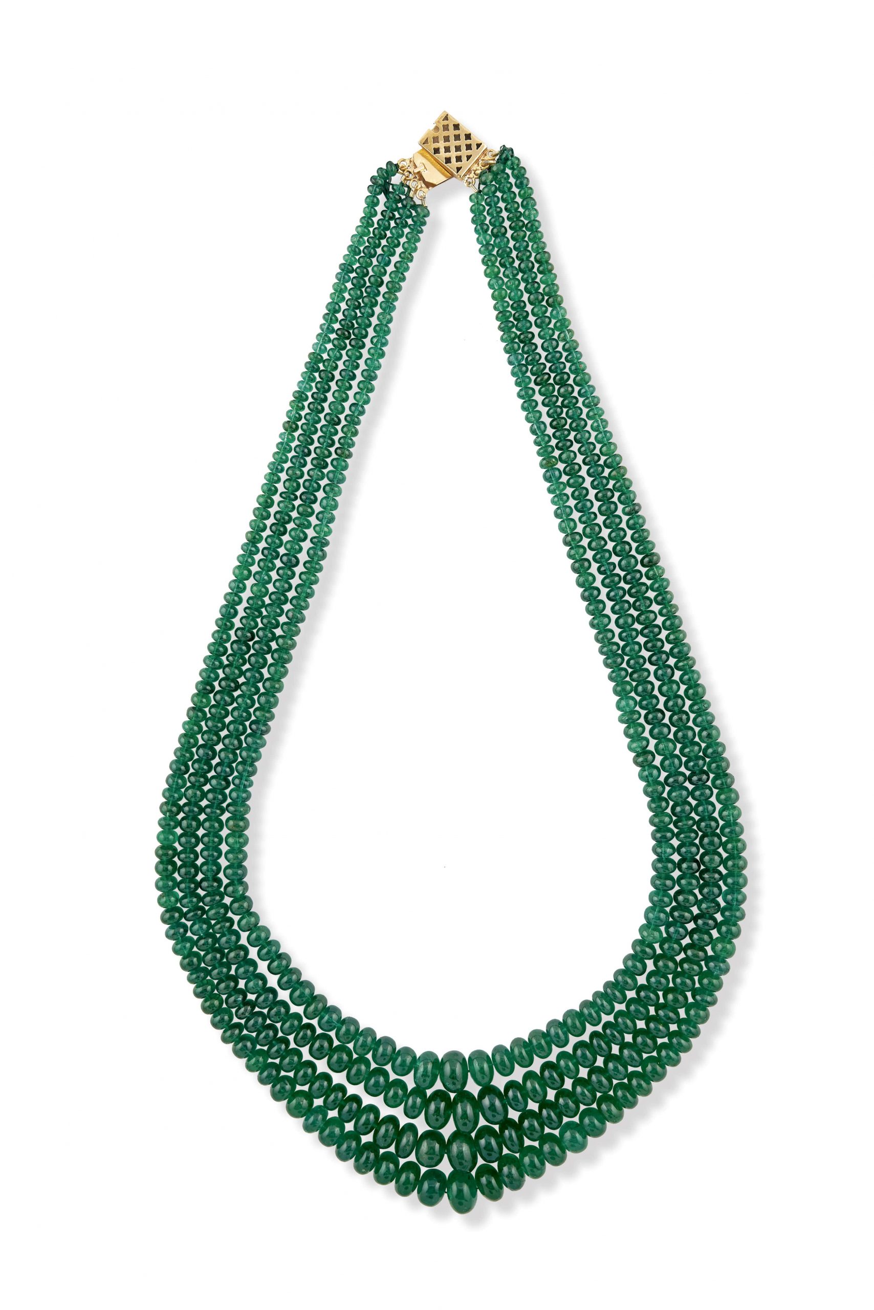 A four-row Zambian emerald bead necklace, lot no. 117, will be offered at an estimate of INR 61,00,000 – 70,00,000. The highlight of this lot are the perfectly rounded and even-toned Zambian beads. The perfect saturation of green exudes a regal lustre which accentuates