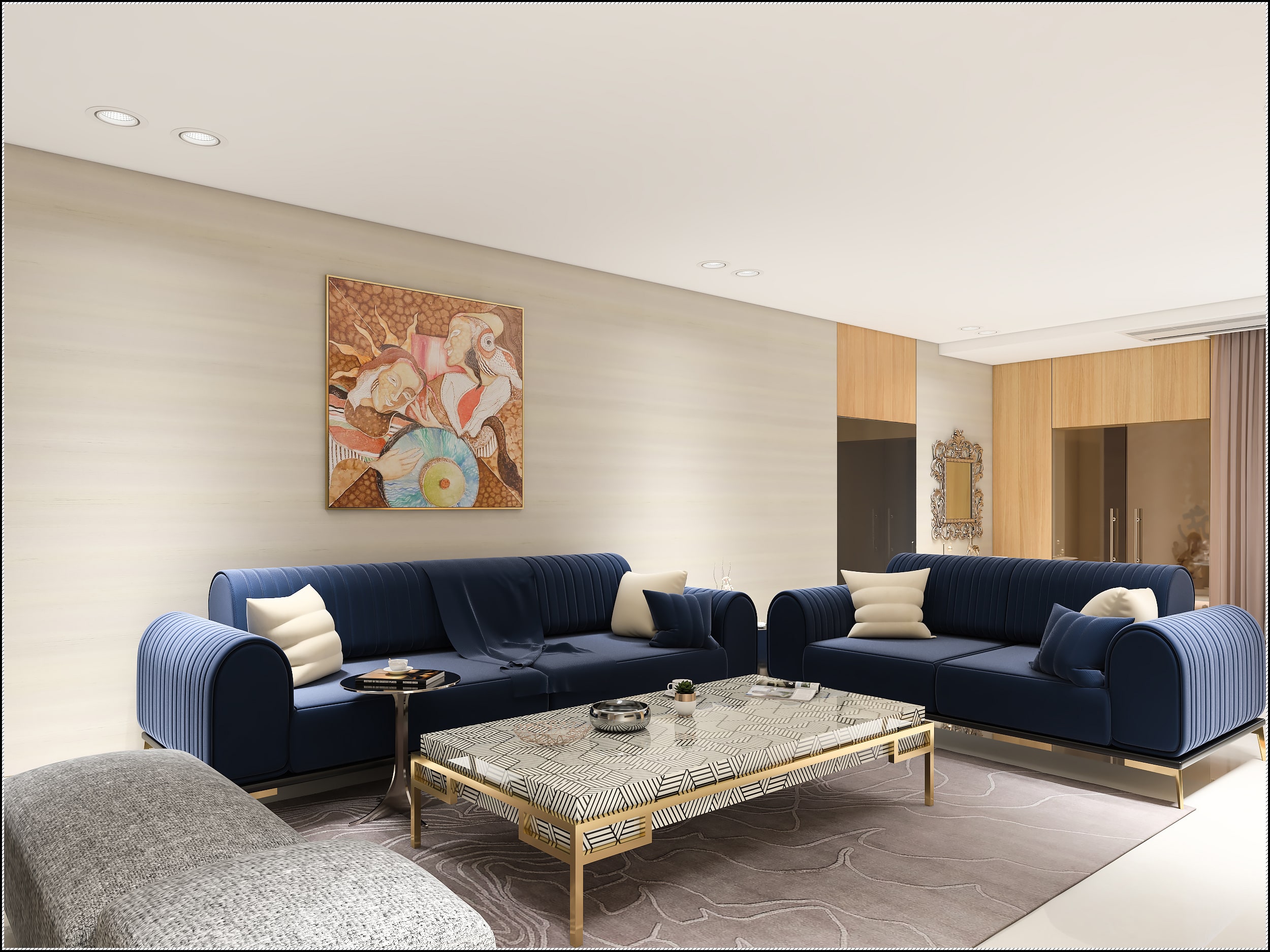 While trying to keep the design minimal as per the client’s wishes, the designers create a space that comes alive with lots of textures and subtle geometric play with a Ravish Vohra center table truly taking centre stage. The vertical patterns of the feature wall behind the TV unit are highlighted with metal strips to add a touch of glimmer. The raw silk wallpaper keeps things subdued, so does the luscious Hands’ carpet with its muted shade, while a painting from Suniyata Khanna’s collection adds a spot of brightness.