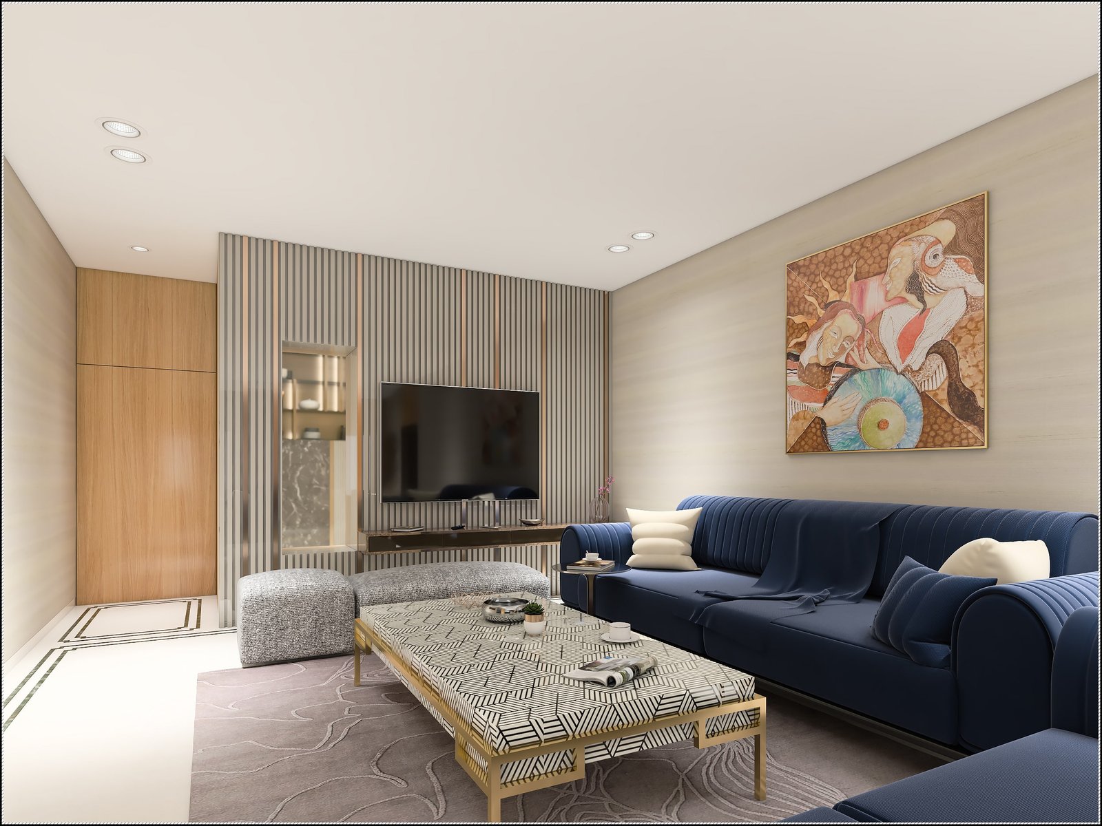 A chic grey palette, clean lines and subtle details give this lounge area its distinctive European flavour. Leatherette wall paneling with metal strips creates a sophisticated backdrop to the room. The TV unit is also made of the same leatherette, with a St. Laurent top. The flooring is Staturiao. The carpet infuses the space with brightness and some graphic elements. A statement light offers stark contrast. The sofa and armchairs are also done up in leather, while the metal and marble center table is rotatable.