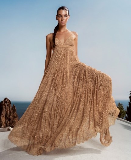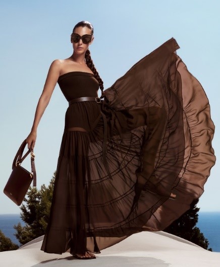 For Spring/Summer 2024, Kors captures a sense of streamlined romance in silhouettes that are short and leggy or soft and floor-sweeping, including fluid goddess gowns, side-slashed skirts and breezy caftans. Empire dresses raise the waistline, while flowing skirts of chiffon and lace elongate the body when paired with sleek bodysuits. Makeup tints, crisp black and white, and glimmering metallics are the featured tones of the campaign. Flat shoes, from barely there sandals to strappy gladiators, add to the air of effortlessness, underscored by an artisanal hand woven bucket bag that nods to the legendary style of Jane Birkin. Finally, to make every chic getaway a breeze, there’s a host of ready-to-travel messenger bags, shoulder bags and accessories.