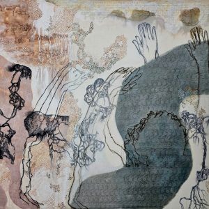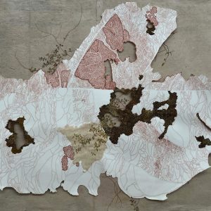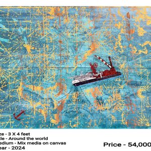 Gopa Roy expresses herself in rich organic material of paper-pulp essaying structures and memories from her homeland, while Kalpana Vishwas uses a precision and innovation of rendering foliage and natural forms. Satyanarayan Gavarra conveys his agrarian roots through a captivating expression in dark hues while Govind Vishwas renders attractive symbolist renderings of the city of Baroda as well as the maps of India on his diaphanous scrolls. Himanshu Jamod, brings to fore his personal narrative of growing up in a maritime family with boats navigating the swirling waters and maps with compasses rendering their navigation. Rutvi Bakharia creates a framed collage of preciously rendered small-format work while Harsha Kancharla brings her white on white abstractionist expression to foreground.