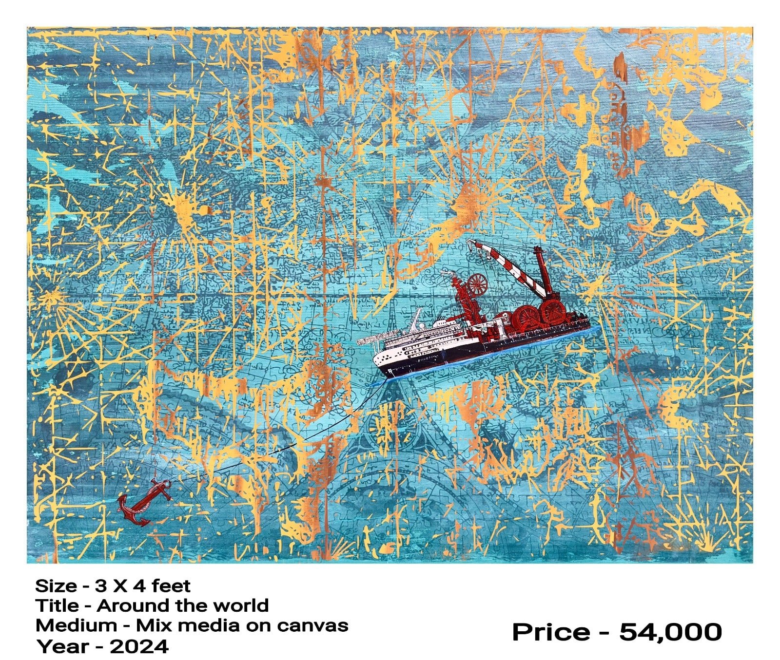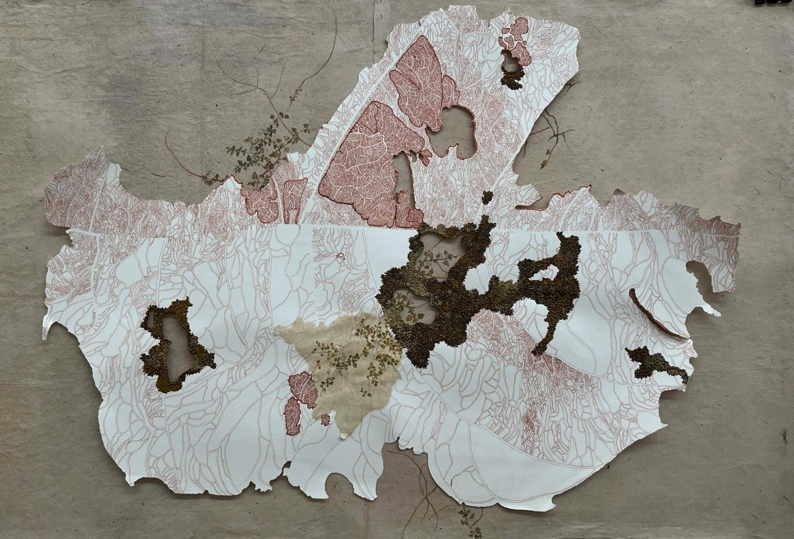 Gopa Roy expresses herself in rich organic material of paper-pulp essaying structures and memories from her homeland, while Kalpana Vishwas uses a precision and innovation of rendering foliage and natural forms. Satyanarayan Gavarra conveys his agrarian roots through a captivating expression in dark hues while Govind Vishwas renders attractive symbolist renderings of the city of Baroda as well as the maps of India on his diaphanous scrolls. Himanshu Jamod, brings to fore his personal narrative of growing up in a maritime family with boats navigating the swirling waters and maps with compasses rendering their navigation. Rutvi Bakharia creates a framed collage of preciously rendered small-format work while Harsha Kancharla brings her white on white abstractionist expression to foreground.