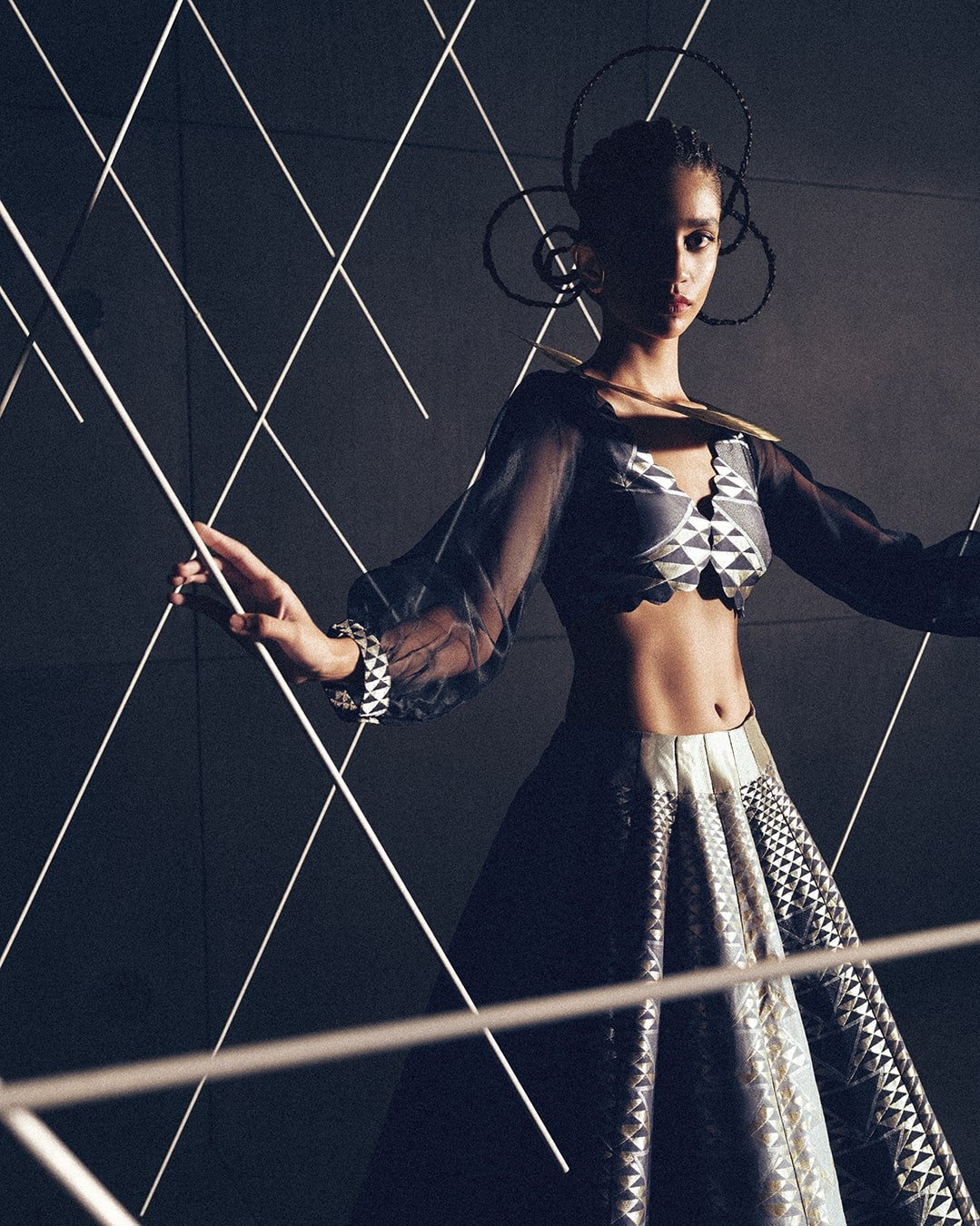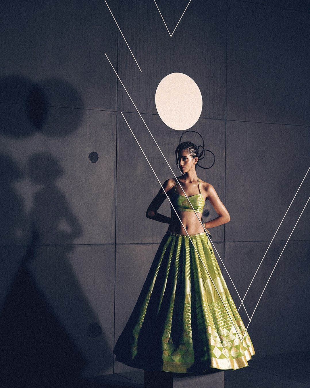 Inspired by painter SH Raza’s study of The Bindu, this collection of lehengas by Shanti Banaras reimagines the spiritual iconography that became the epicenter of the artist’s universe. In an exploration of circles, triangles, and lines, there lies a contemplation of the source of energy and creation. In Raza’s art, this is interpreted as order and proportion, and in Shanti Banaras’ expression in handwoven Rangkat organza, it is interpreted as one moment in a life of many living moments.