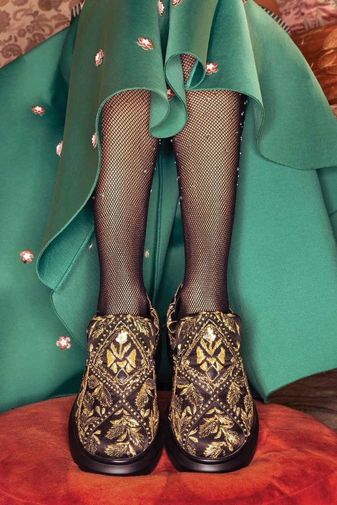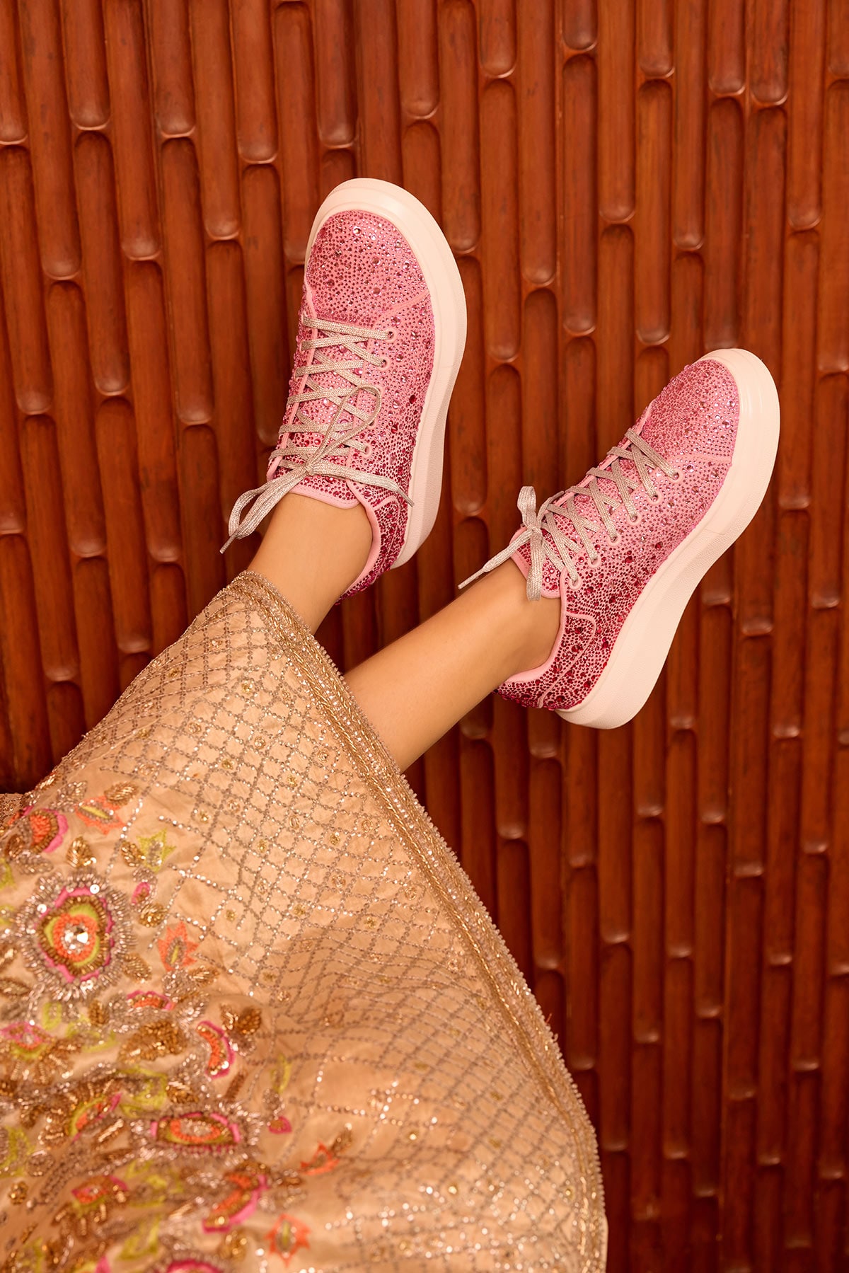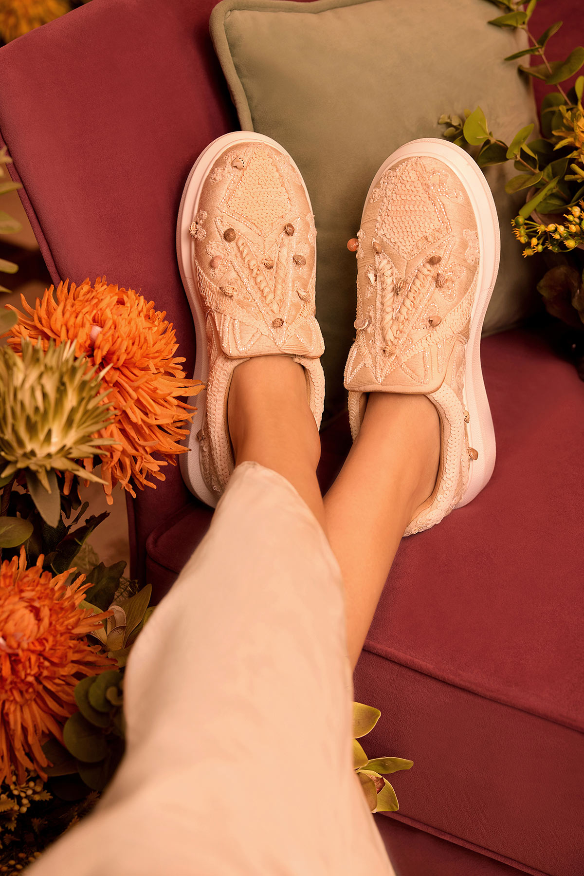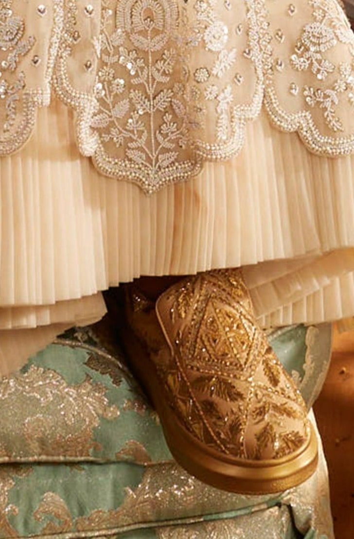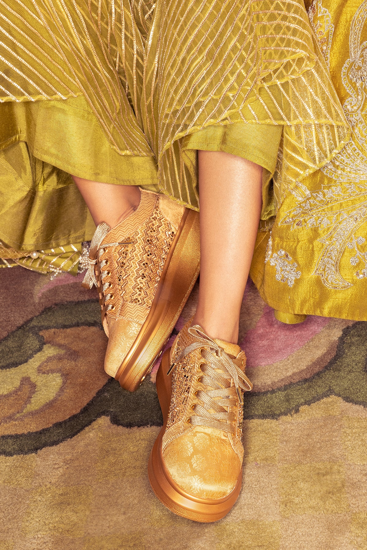 Step into Anaar’s world where classic sneakers like Honeybee and The Empress reign supreme! These kicks aren’t just shoes; they’re a celebration waiting to happen. With Honeybee, it’s like walking on sunshine with its sparkling gota work and mesmerizing embroidery. Made from satin, they redefine luxury. Prefer something subtler? Meet The Empress, balancing festivity with casual charm flawlessly. Its brocade work is pure art, while the dabka pitta and hand-cut bead embellishments scream party-ready. Even the soles and laces shine in gold! So, slip into Anaar’s creations, and let your feet do the talking – after all, who needs a crown when you’ve got these royal sneakers?