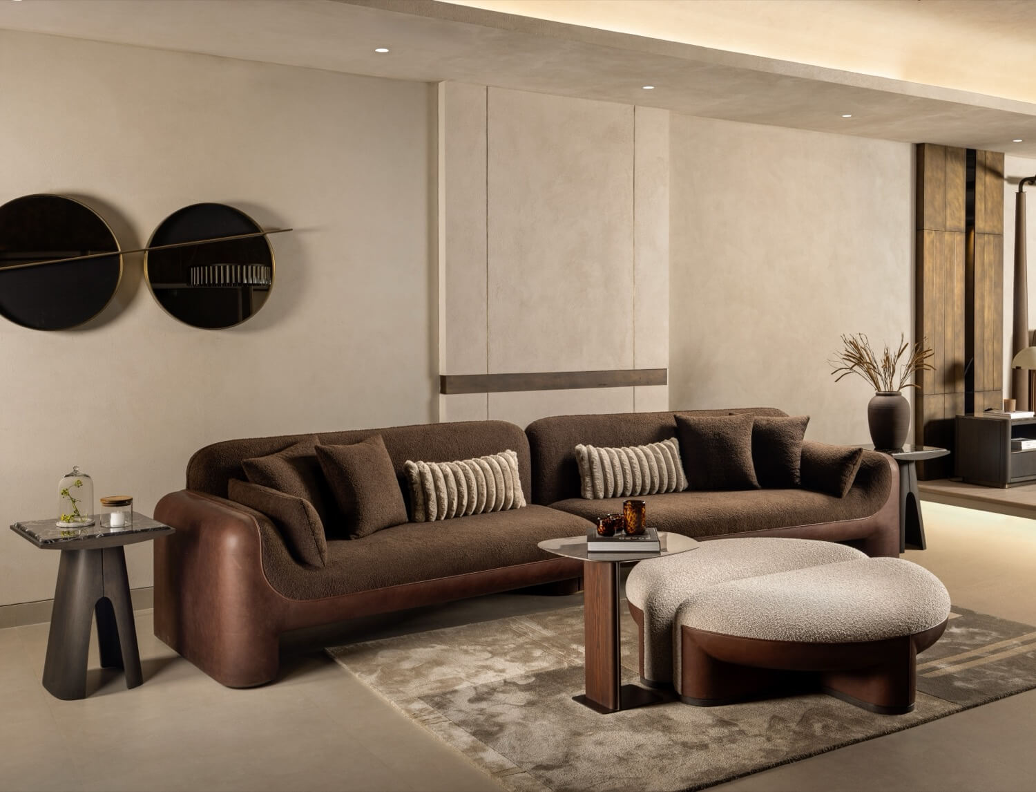 Description: Zilio Sofa features a sculptural, monolithic form with smooth, flowing contours. Its fully upholstered rounded seat merges into curved armrests and a plush backrest, creating an inviting silhouette for festive gatherings. Subtle material contrasts, curved seam detailing and brushed metal accents add refined warmth and contemporary elegance to Christmas-ready interiors