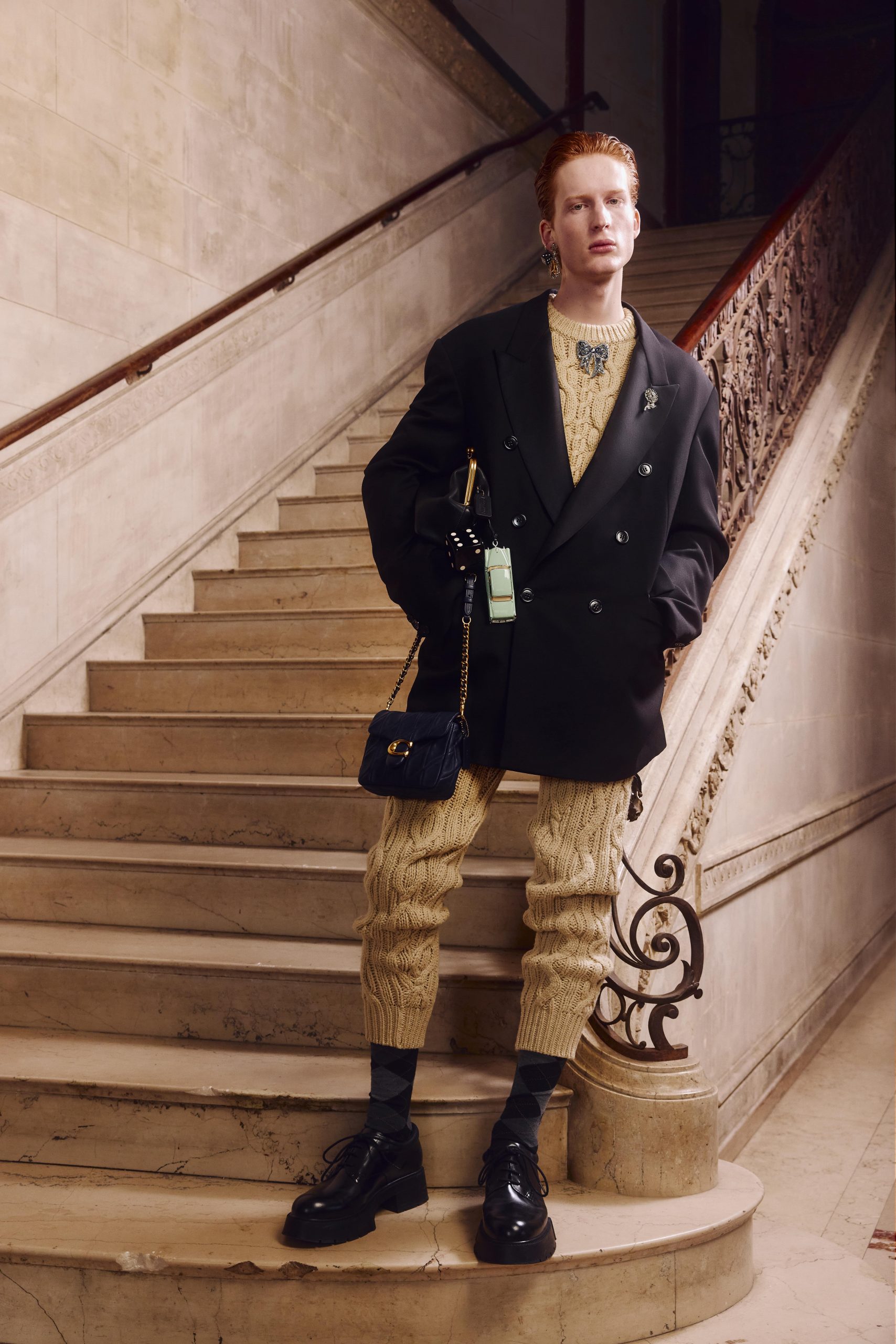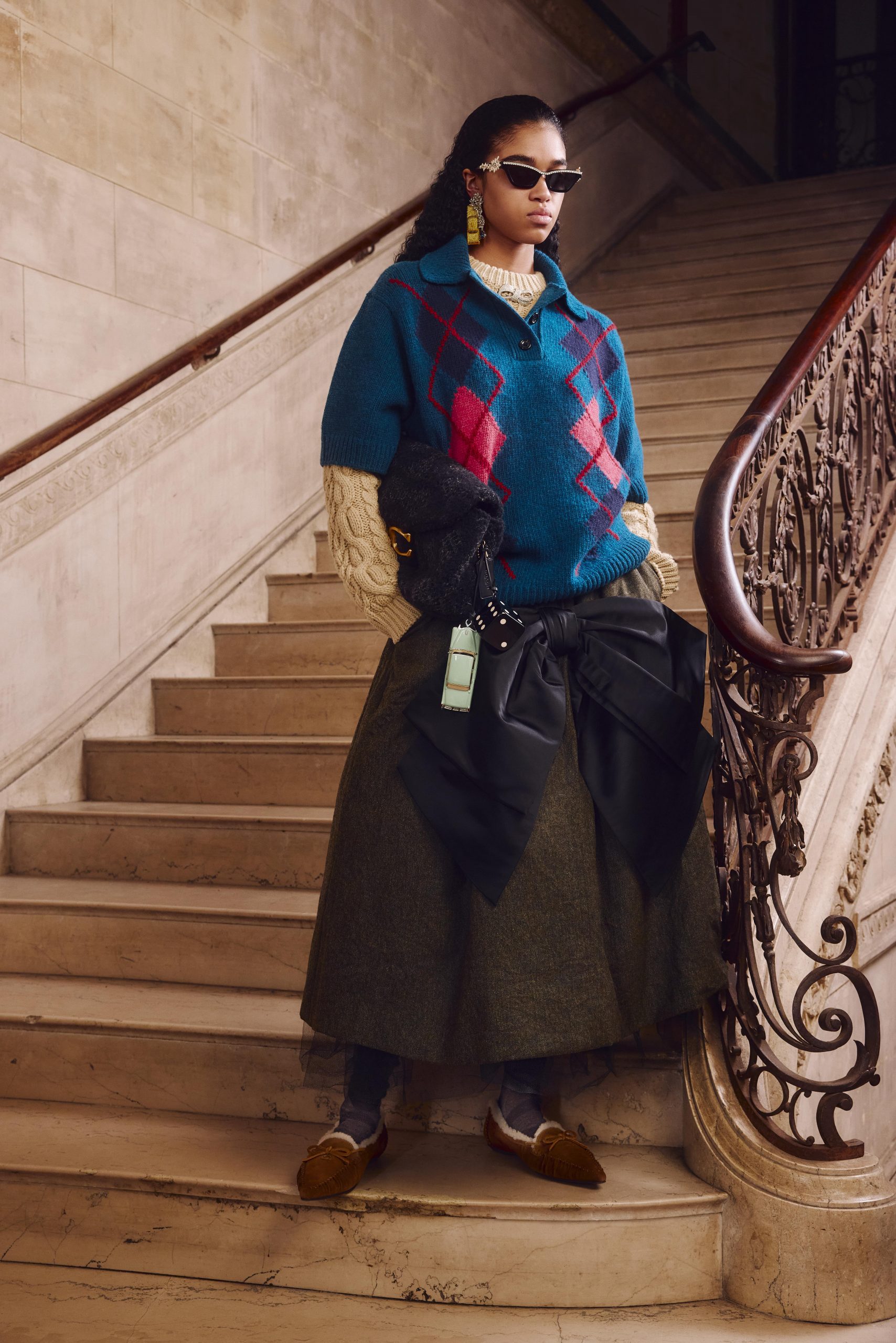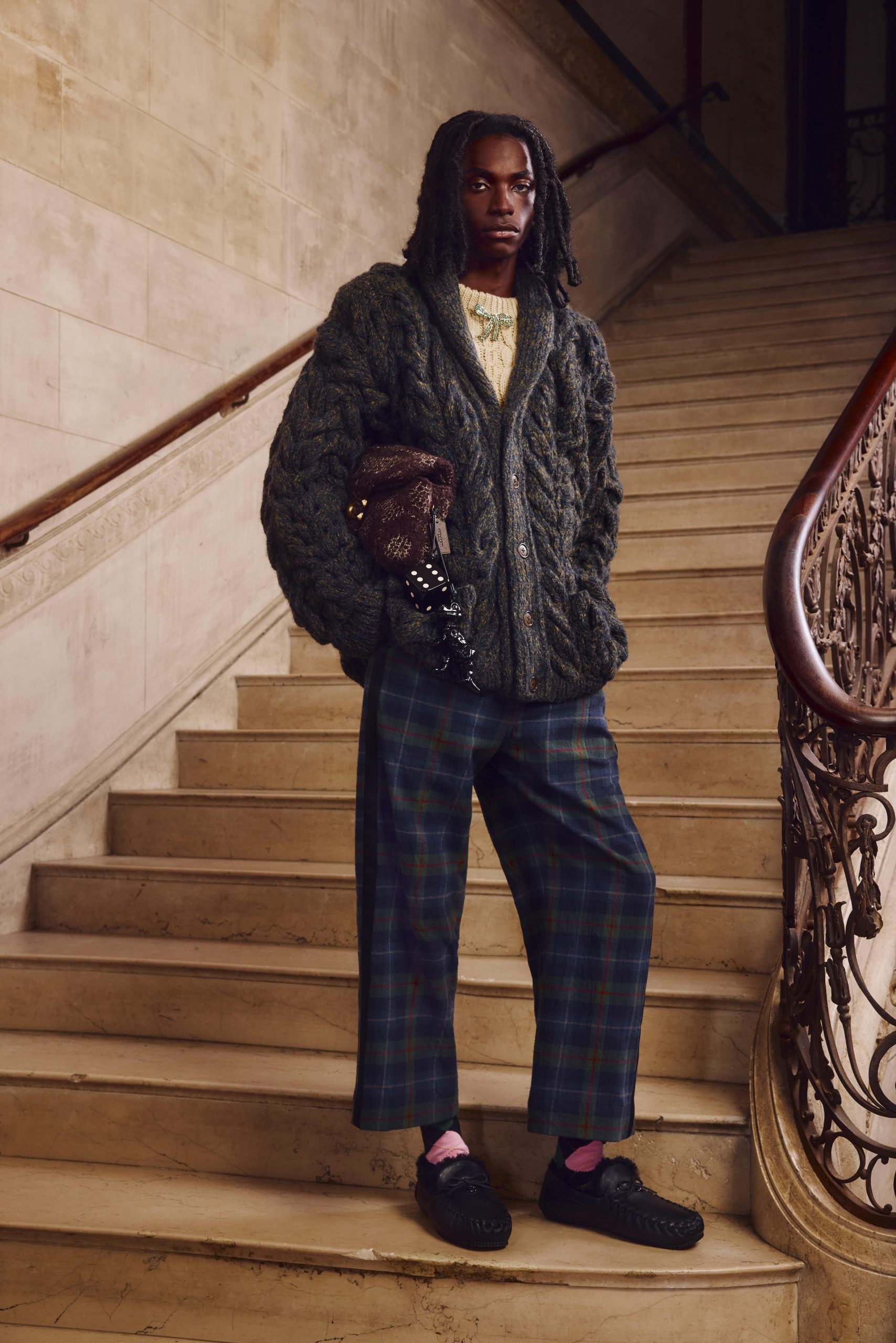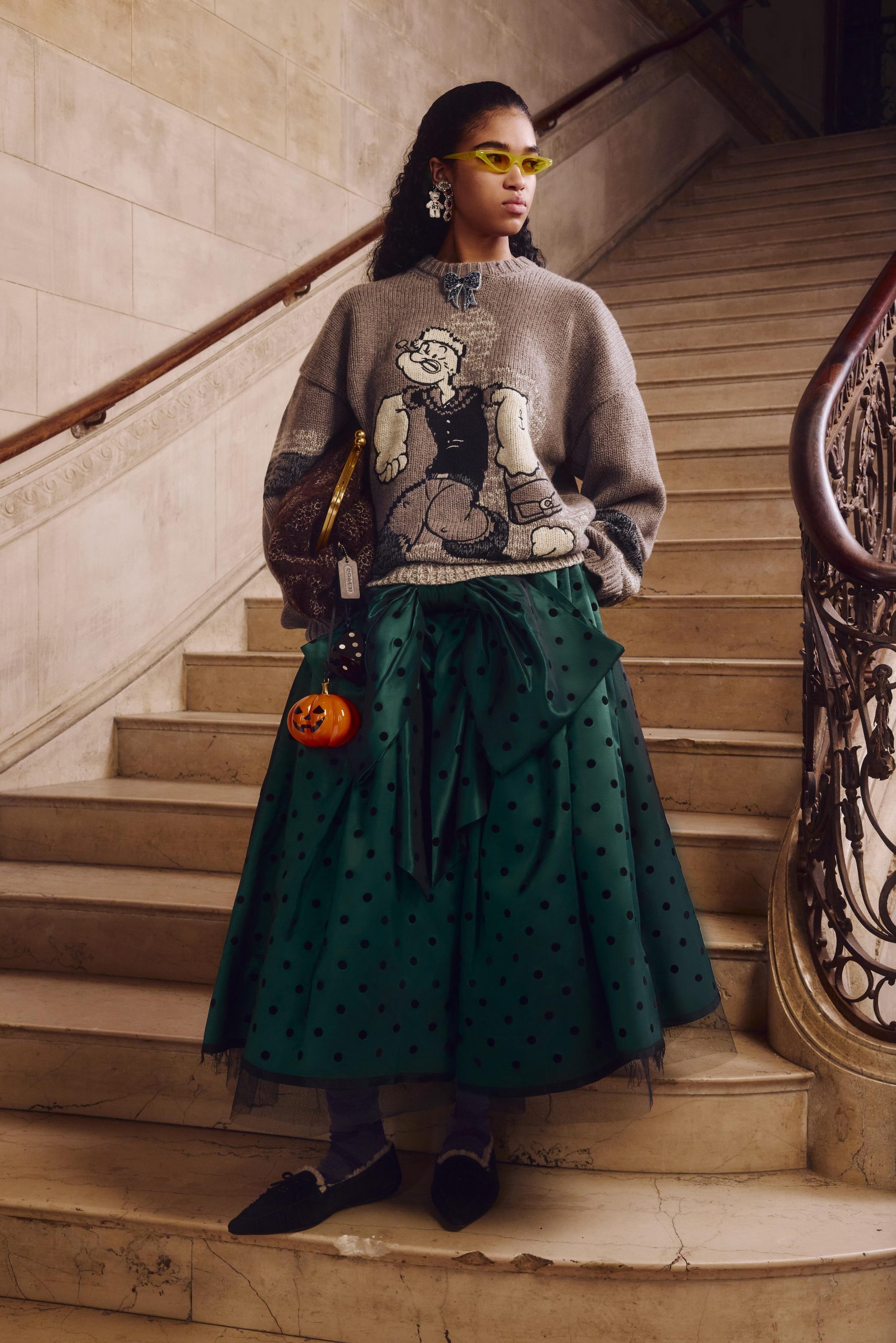 Further exploring Fall’s juxtaposition of American classicism with a youthful, counter-cultural attitude, Winter 2024 brought time-tested, iconic pieces up-to-date and in real-world contexts, proposing a free-spirited sensibility where traditional concepts of dressing up and dressing down begin to mix and merge. Knitwear was a cornerstone of the collection, applied in argyle, cable-knit and intarsia cardigans, sweaters and leggings. Tailored tuxedo jackets and full skirts in tweed and taffeta played against plaid pants, boxer shorts and T-shirts and sweaters emblazoned with the image of comic and cartoon character Popeye carrying the house’s iconic Tabby bag. The collection also featured a selection of leather outerwear, including bold statement jackets crafted in expressive colors such as metallic gold and pale blue.