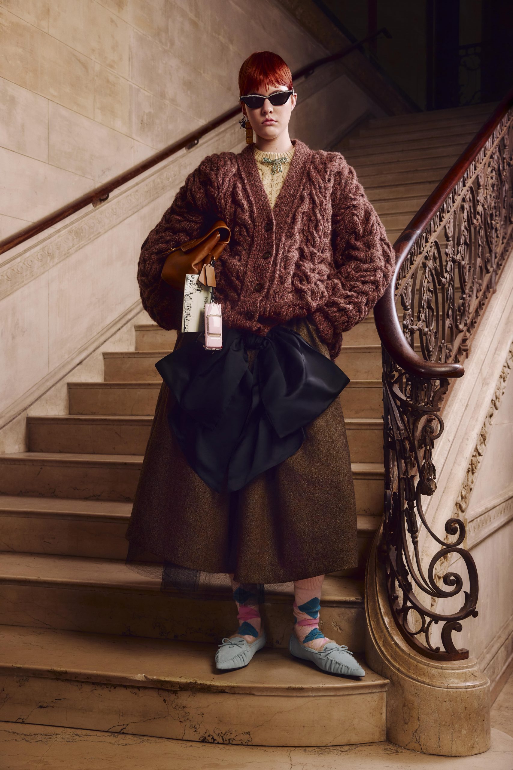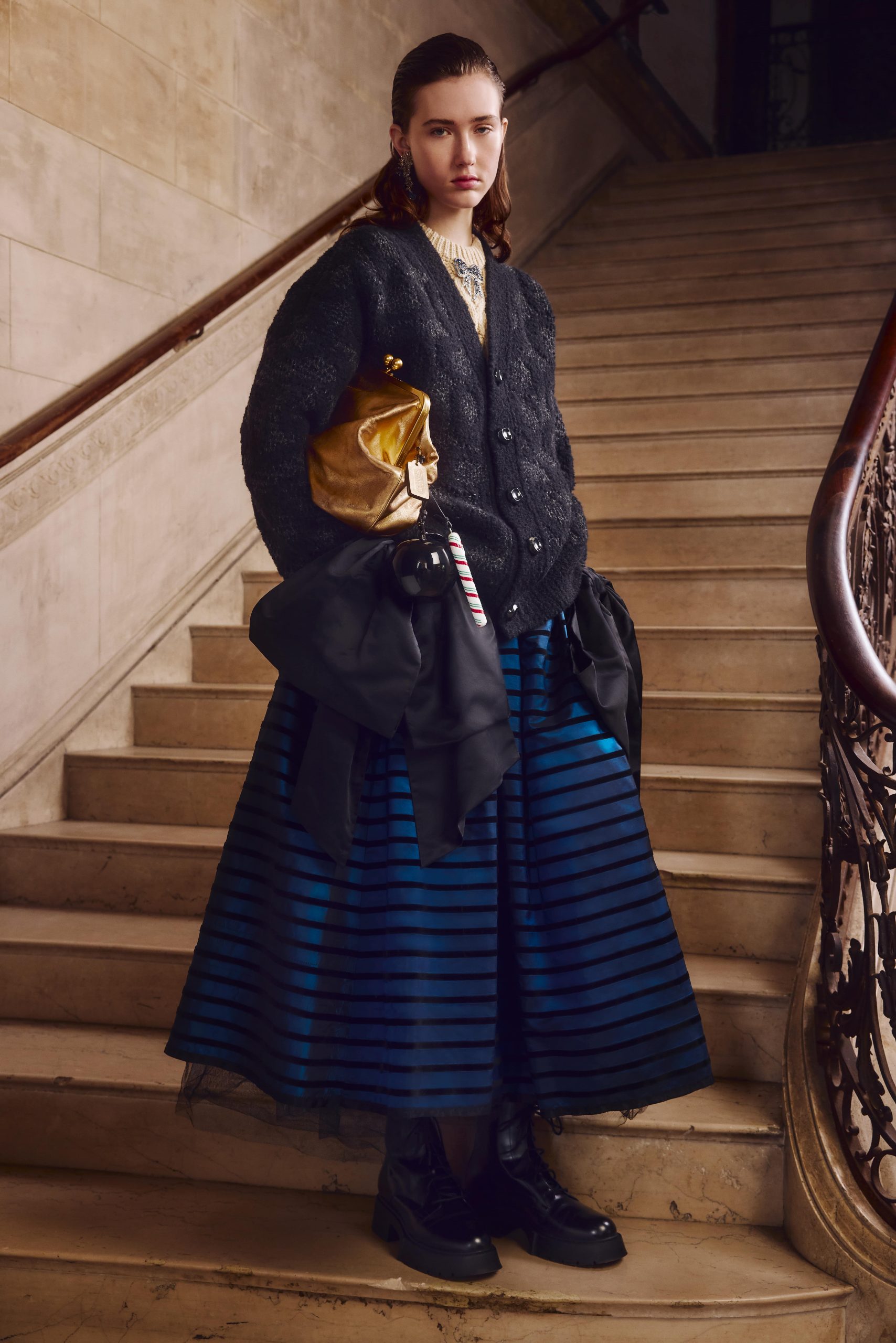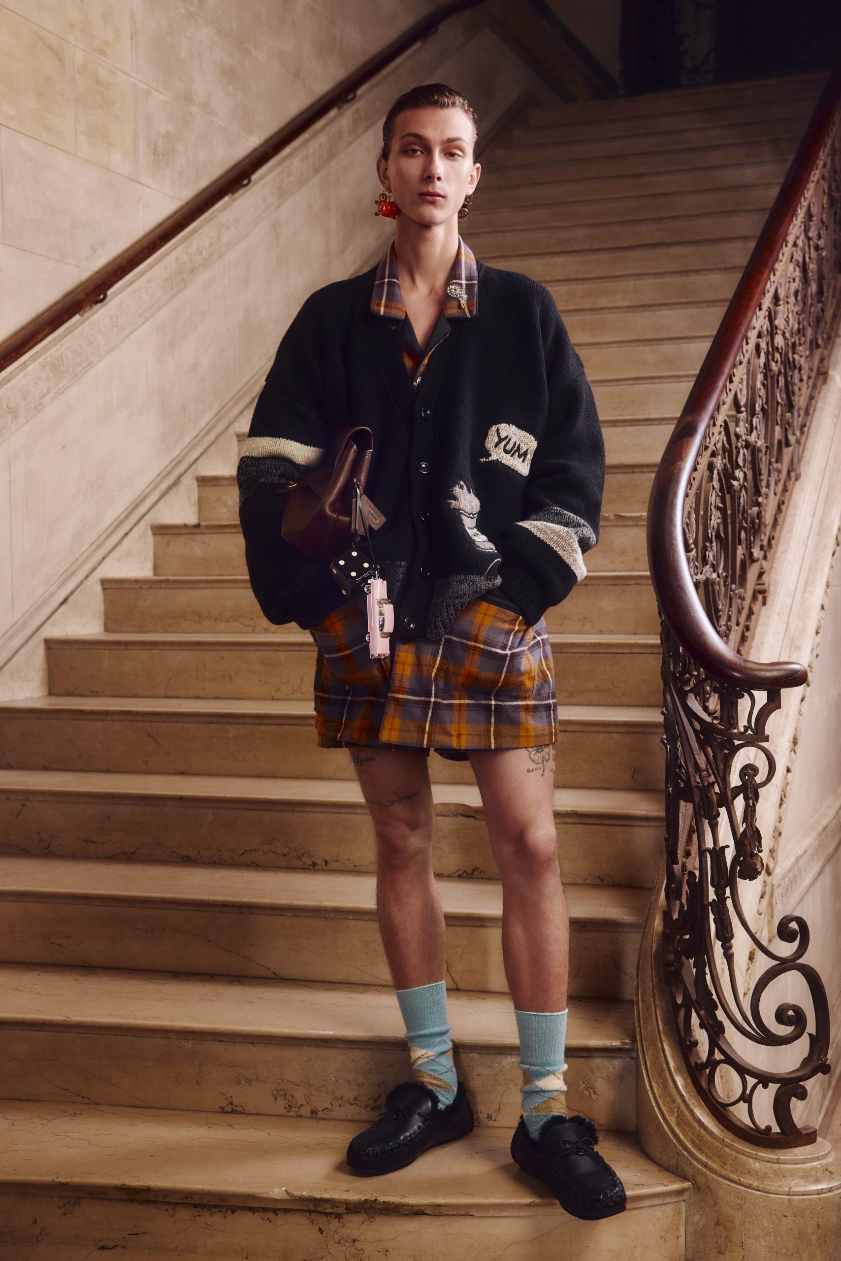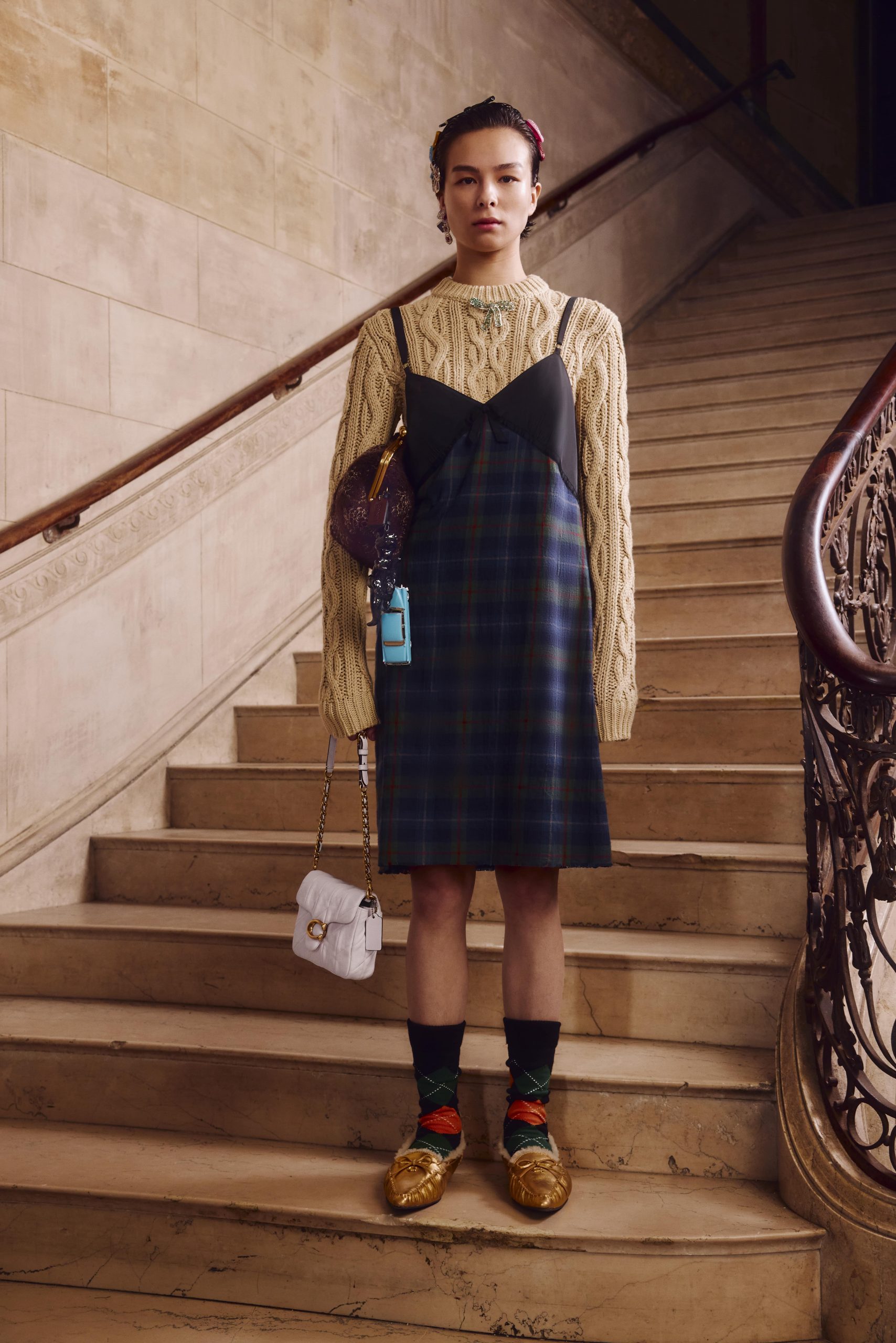 Further exploring Fall’s juxtaposition of American classicism with a youthful, counter-cultural attitude, Winter 2024 brought time-tested, iconic pieces up-to-date and in real-world contexts, proposing a free-spirited sensibility where traditional concepts of dressing up and dressing down begin to mix and merge. Knitwear was a cornerstone of the collection, applied in argyle, cable-knit and intarsia cardigans, sweaters and leggings. Tailored tuxedo jackets and full skirts in tweed and taffeta played against plaid pants, boxer shorts and T-shirts and sweaters emblazoned with the image of comic and cartoon character Popeye carrying the house’s iconic Tabby bag. The collection also featured a selection of leather outerwear, including bold statement jackets crafted in expressive colors such as metallic gold and pale blue.
