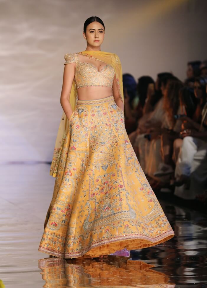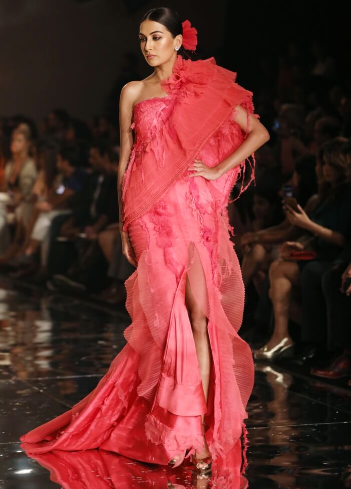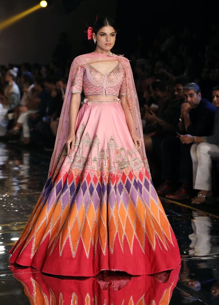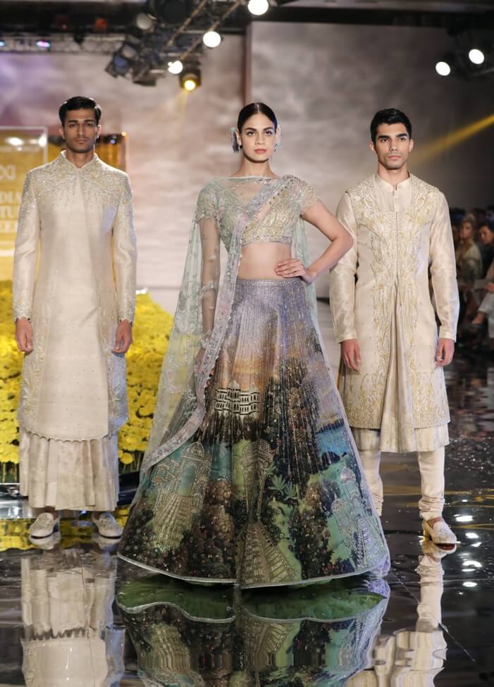 The 2019 couture shown on the ramp was based on Varanasi. It is a collection that is eccentric and opulent, and reflects the culture found in the ghats of Varanasi and the traditions of India. “The collection brings out Indian heritage and culture through colours. We have used seven colors in the collection. Embroidery techniques have been contemporized and we have used nakshi, dabka, sequins, Swarovski crystals, ghungroos, feathers, raffia and lace to make our garments look exclusive and extravagant.”