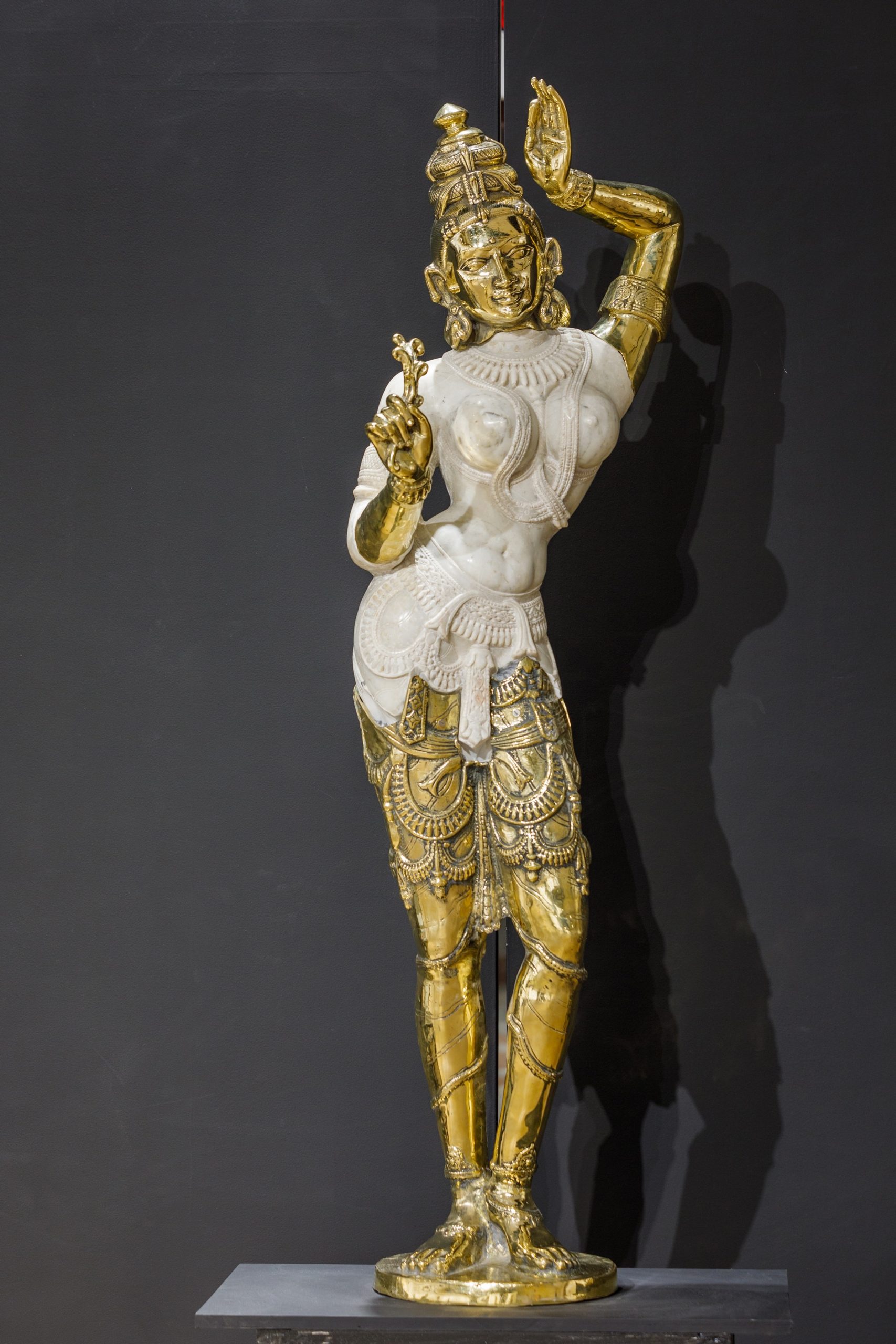 The exhibition, titled “Colour, Stone, Chintz, Grain, and Statue,” will feature a circular constellation of 27 sculptures in bronze, marble, granite, stoneware, glass, terracotta, ceramic, iron, and paper. Each sculpture is an Apsara, a celestial being from Indian mythology, and together they mirror Raj’s own identity as an artist, performer, and beloved, yet alone individual.