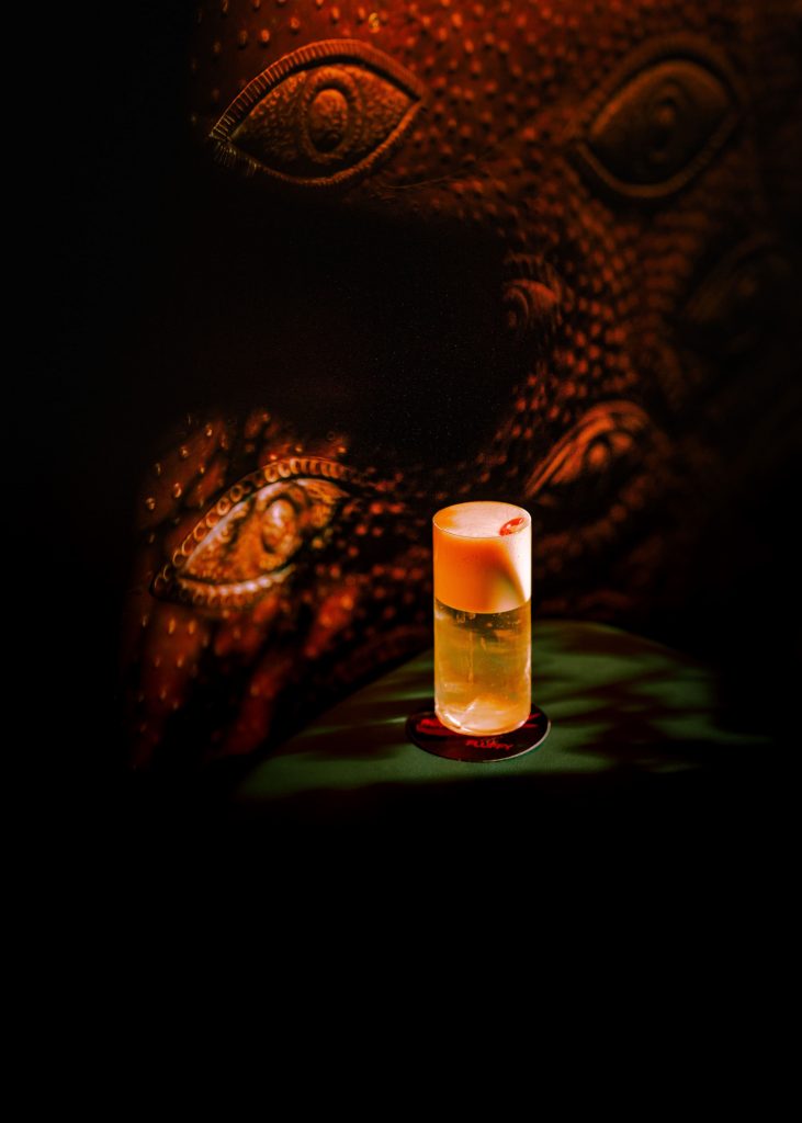 -THE ELEPHANT PALOMA – made with Mezcal, Tequila, Smoked Basil, Grapefruit Soda, and Maldon Salt, comes with an orange coin garnish stamped with Siddharth’s version of Salvador Dali’s iconic “Surrealist Elephant” from “Dream Caused by the Flight of a Bee Around a Pomegranate a Second Before Awakening” (1944).