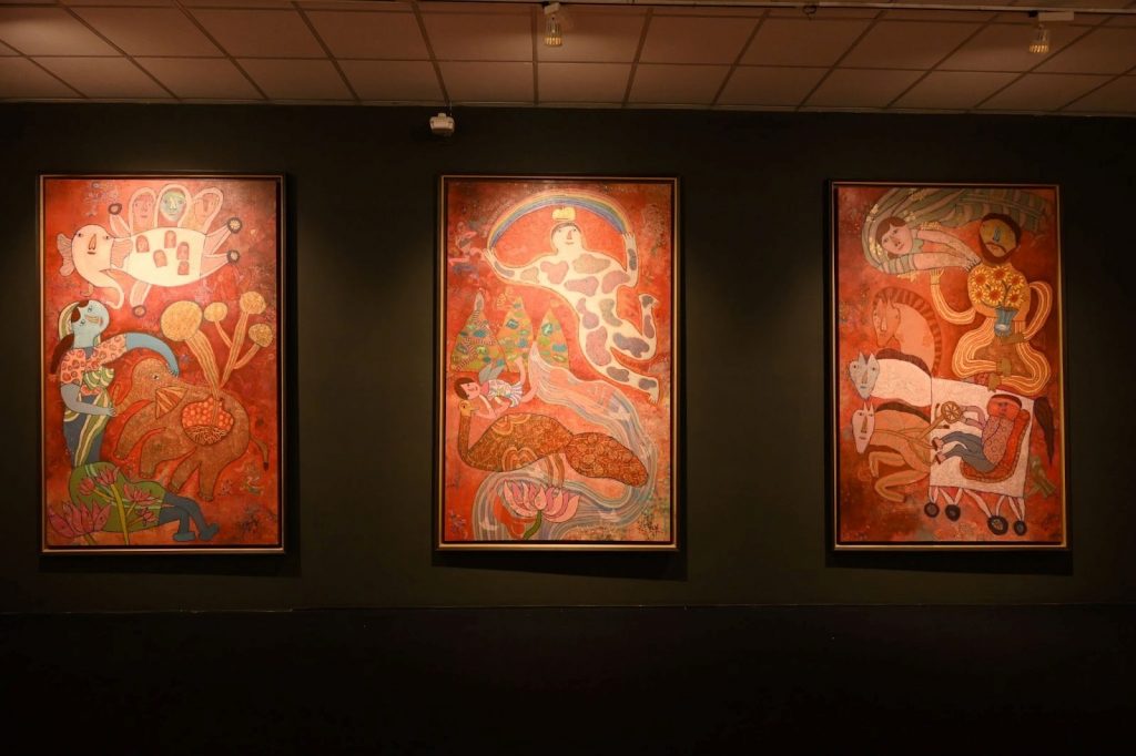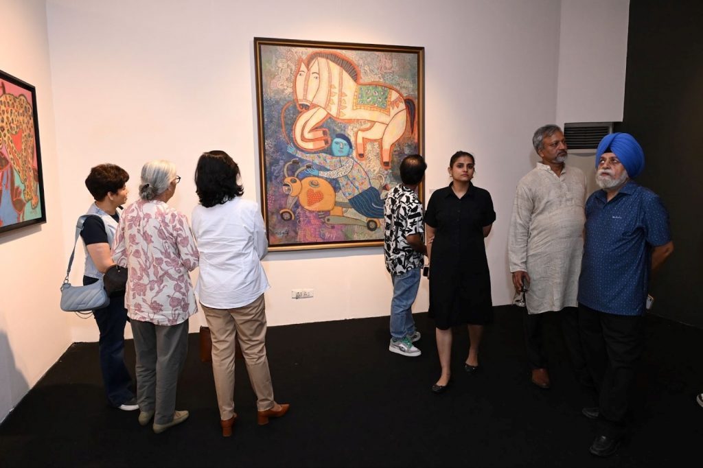 In contrast, Shahid Parvez’s works brought a spirit of spontaneity and innocence. Drawing from the folk traditions of the world, his paintings expressed a sense of playfulness layered with emotional depth. His compositions, often built through mixed media and textured layering, reflected not only cultural memory but also the freedom of personal exploration. Together, his pieces offered a counterpoint to Tanushree’s narrative approach—less structured, but equally evocative.