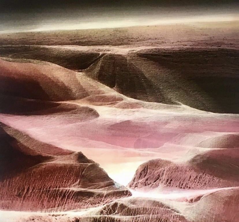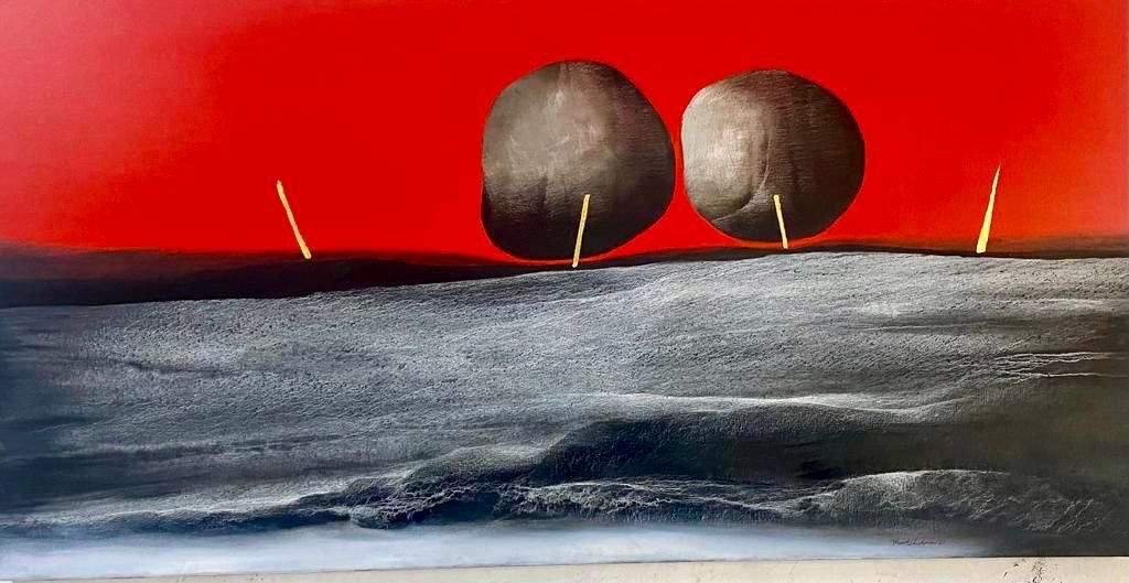 The Mystical Mountains celebrates the simplistic use of colour aligning it with the minimalistic zen philosophy – simple yet very powerful. Vinod Sharma’s colour palette ranges from black and white to natural shades and sometimes to even primary hues of reds and blues. His technique is unique to him which he has developed and perfected over four long decades.