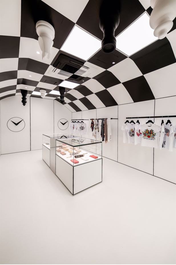 With this mood in mind, going up to the first floor, one is struck by the presence of a totemic-shaped display element, composed of overlapping gaming dice taking the customer into a fairytale experience, which continues entering the adjoining room, where a chessboard molds on the vault, letting some pieces fall which, as in a Metaphysical work, lose the influence of the force of gravity following the curvilinear line of the vault itself.
