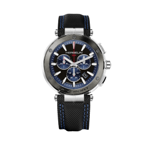 The Newport – Chronograph – Black PVD Steel (Newport-Chronographe-Acier PVD Noir) 37688AG65, an emblematic model from Herbelin’s Newport collection, offers a lasting impression. The watch features a round 316L Stainless Steel, Anthracite PVD case encircling a brushed black dial. Marine-blue accents and a striking red seconds hand complement the dial, powered by a 5040 D – 12 ½”’ movement calibre.
