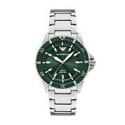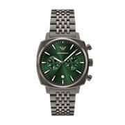 Framed in a 40mm cushion-shaped case, this Emporio Armani watch showcases a deep green sunray dial complemented by a gunmetal-tone stainless steel bracelet with brushed and polished finishes. The quartz chronograph movement and date display at 6 o’clock combine functionality with timeless style, making it a standout accessory for holiday occasions.
