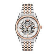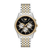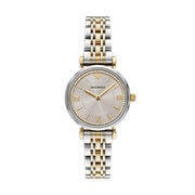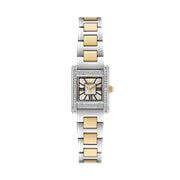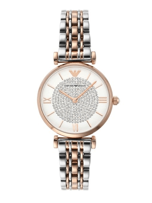 Emporio Armani’s 20 x 26mm watch features a warm grey sunray dial with Roman numeral indexes, framed in a two-tone stainless steel case adorned with crystal embellishments. The matching two-tone bracelet completes the refined look, while the two-hand movement ensures timeless precision—making it a sophisticated choice for festive occasions and holiday celebrations