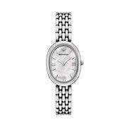 Emporio Armani’s 26 x 34mm watch features a white mother-of-pearl dial with Roman numeral indexes, paired with an intricate multilink stainless steel bracelet. The elegant oval silhouette makes it a perfect dress accessory for holiday occasions.