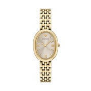 Emporio Armani’s 26 x 34mm watch features a warm grey sunray dial with gold-tone Roman numeral indexes, paired with an intricate multilink gold-tone stainless steel bracelet. The distinct oval silhouette creates a refined dress watch, perfect for festive occasions and sophisticated holiday styling.