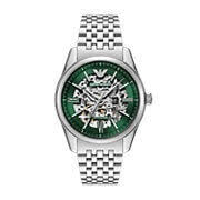 This open skeleton automatic watch features a 43mm case and a green sunray dial, adding a festive pop of color to any dress watch. The polished seven-link stainless steel bracelet, Roman numeral dial, and applied branding details create a refined, elevated look perfect for holiday celebrations and standout festive evenings.