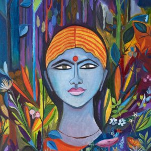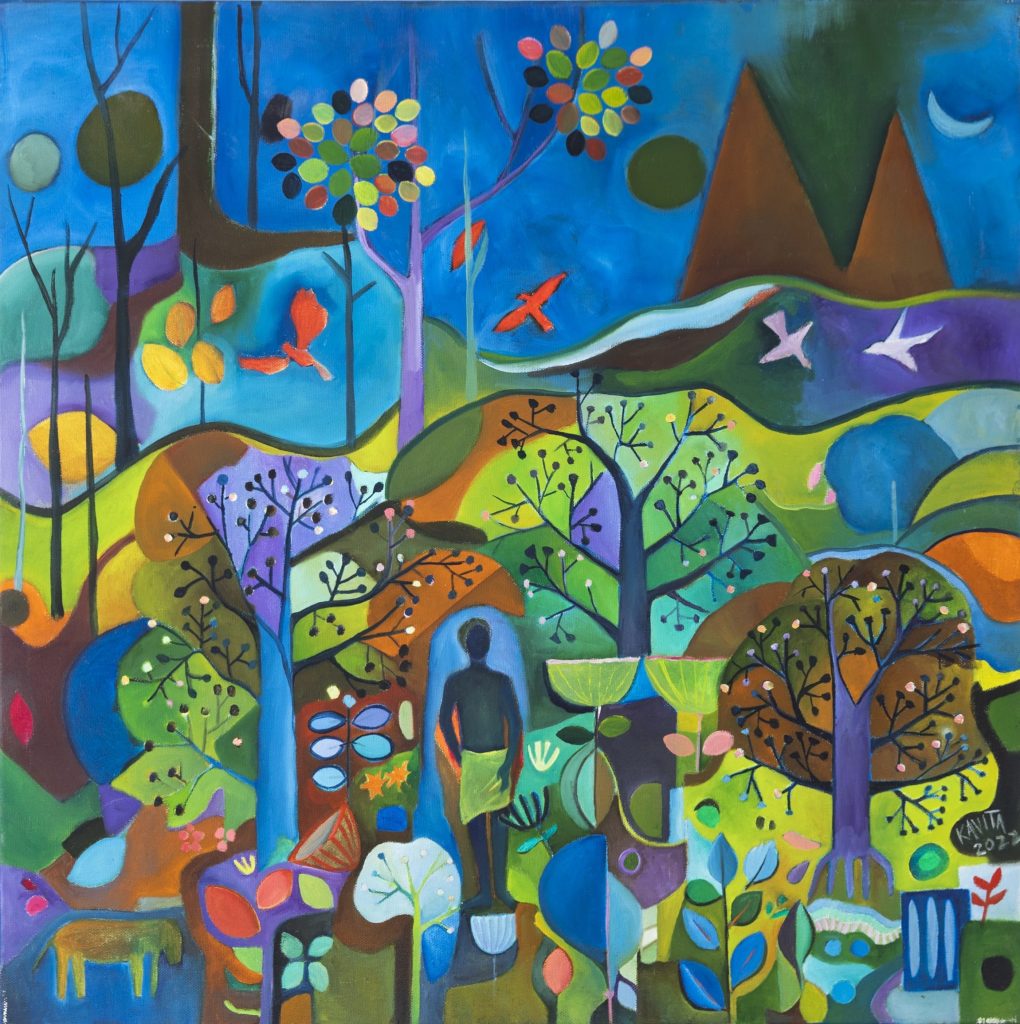 The exhibition showcases Kavita’s recent works rendered in oil on canvas. The works are mesmerising evocations of the plenitude of forests and the people who live there in natural harmony. The experience of forests was an integral part of Kavita’s growing up years in Gomia, Jharkhand surrounded as it was by forests, river and hills. Inspired by the memories of the town, Kavita made a photobook on Gomia, and this exhibition is her tribute to the forests which were an integral part of her childhood. Kavita’s art carries the rhythms of her own life and the deeper rhythms of nature, of the mother earth in its glorious profusion, a profusion that holds humanity in its embrace whether one chooses to believe or not, and sings the song of enchantment.