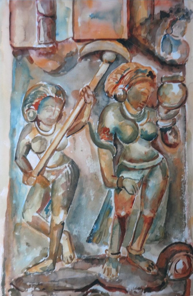 Shubha’s paintings are also deeply influenced by the mythology surrounding the Ganga. According to legend, the river descended from the heavens to the Himalayas to bless humanity. Her watercolor art remains true to these ancient depictions, portraying the Ganga both as a flowing river and a divine goddess as seen in temples and sculptures. Her art gallery displays works where she brings a softness and fluidity to these traditional stone images, making them feel almost alive. In one of her artworks, Ganga stands atop the mythical creature Makara, symbolizing the life-sustaining force of water. Ancient temple ruins dedicated to Ganga seem to come to life in her paintings, showing her skill with watercolor and her deep reverence for the subject.