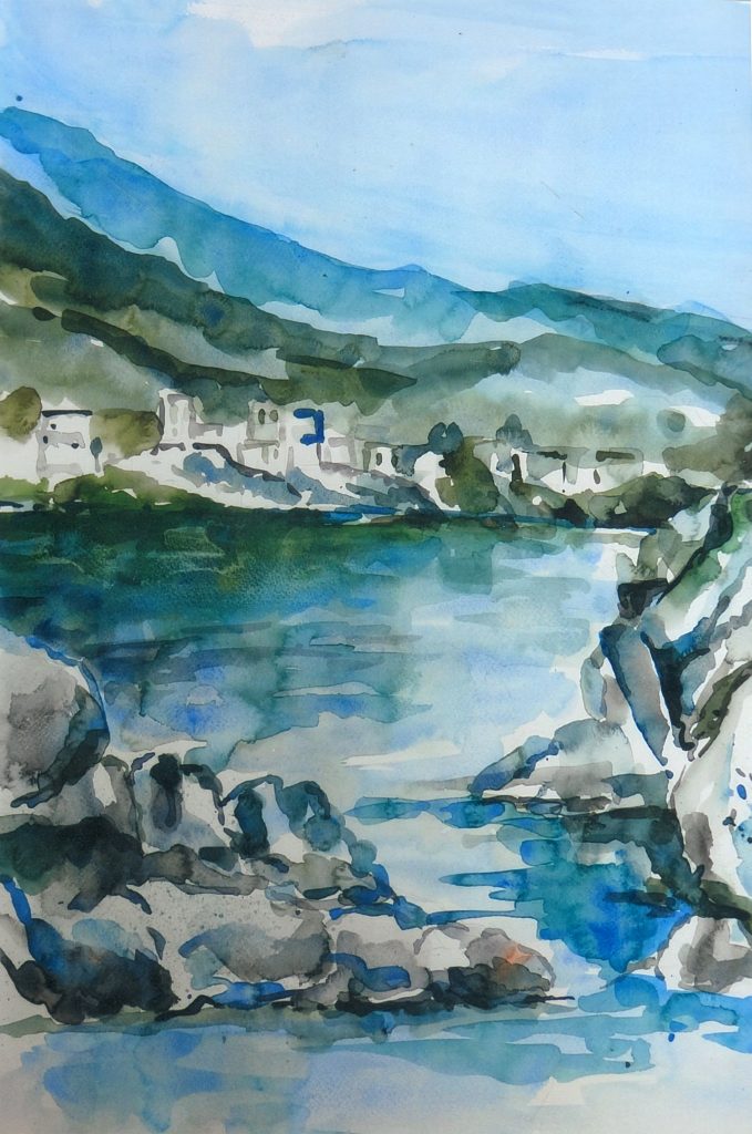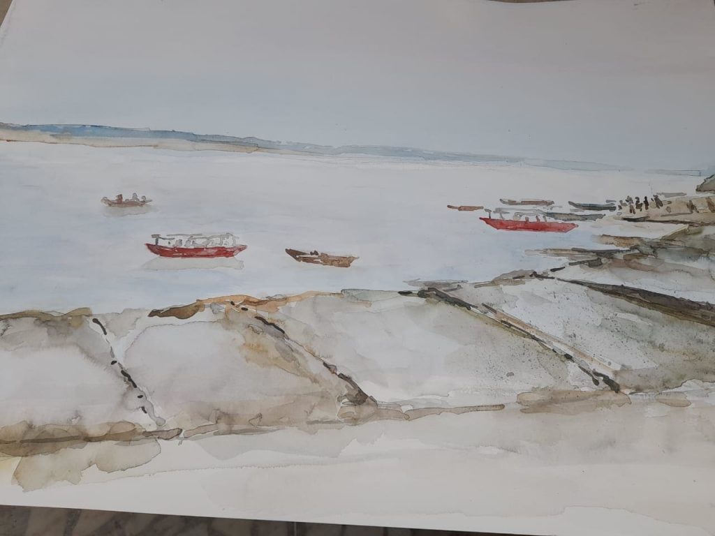 As the Ganga flows downstream, it is joined by other tributaries like the Alaknanda and Mandakini. At Prayagraj, her confluence with the Yamuna is captured beautifully in Shubha’s watercolor paintings, especially during the magical moments of sunrise and sunset. Further along in Banaras, the river is celebrated as holy, and Shubha’s art beautifully captures the vibrant ghats and the continuous stream of pilgrims who seek a holy dip for spiritual salvation.