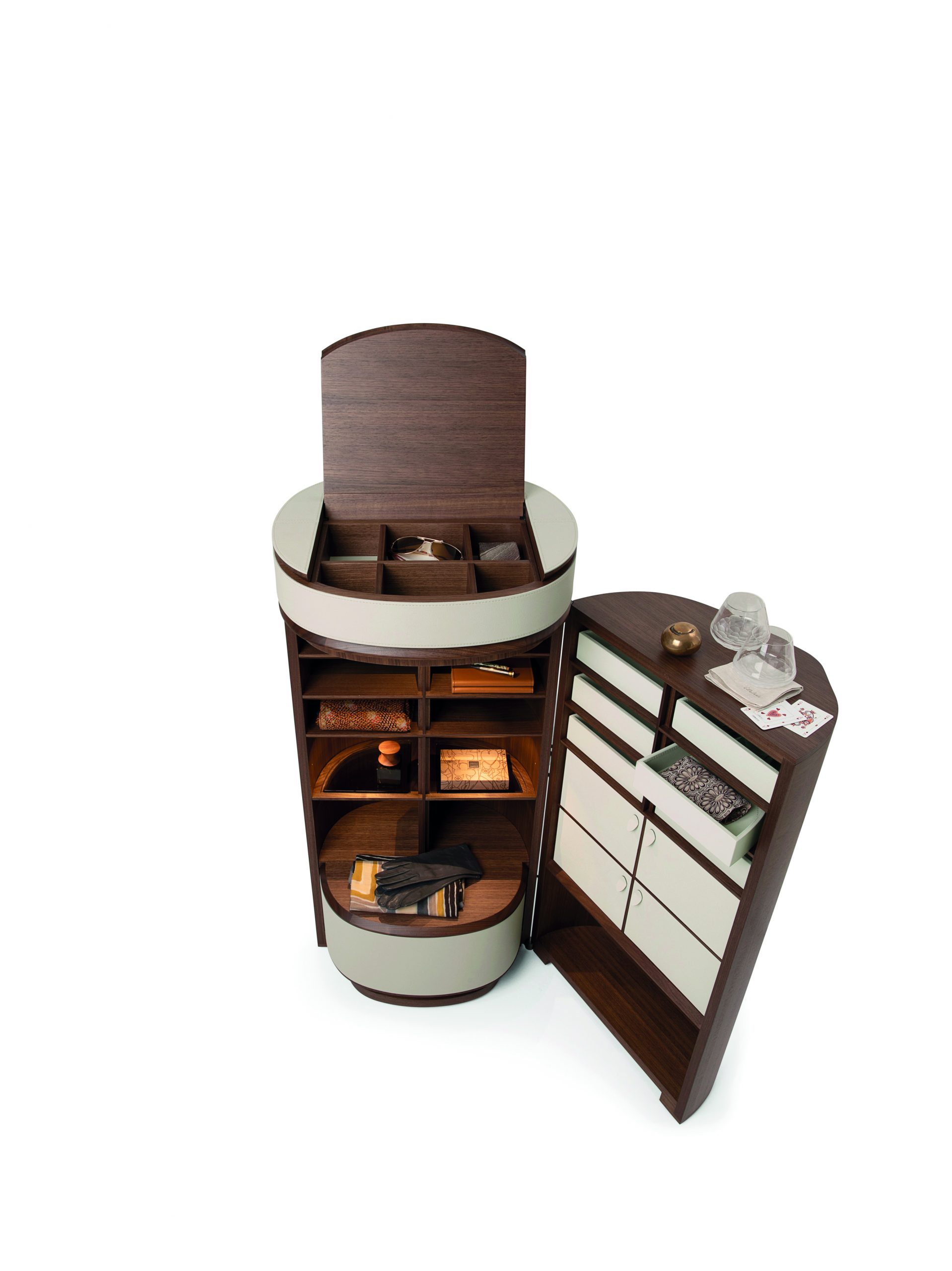 Sculptural and monumental, this storage unit reveals Giorgetti’s cabinet-making tradition: the external decoration is given by inlays in grey maple or natural canaletto walnut placed according to the direction of the vein.