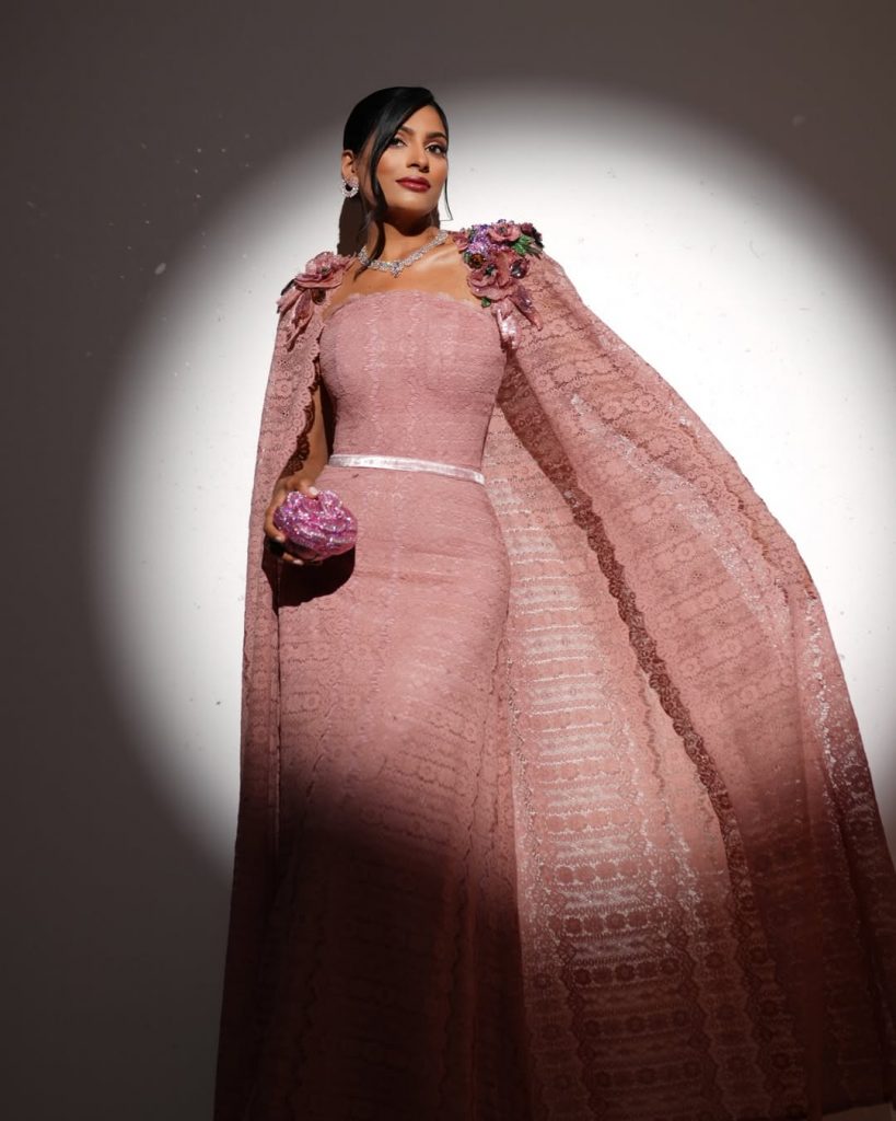 a touch of cinematic glamour to her already show-stopping look. Her outfit blended