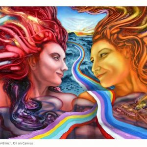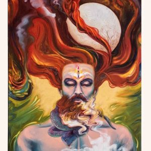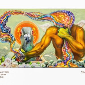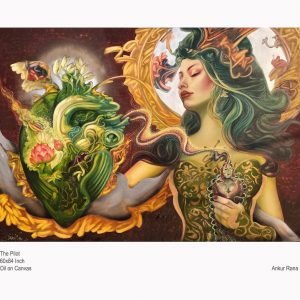 Within this context, Rana’s works investigate primary emotions and instincts such as preservation of the self, the search for companionship, the desire for love, and the human need to engage with one’s environment. His paintings often blur the boundaries between human, animal, and divine realms, reflecting survival as well as transcendence. In The Bait, Rana employs irony through an oriental woman releasing hearts from her bosom while a man uses the Taj Mahal as bait, commenting on instinct, desire, and survival. In Shallow vs Supreme, Lord Shiva is re-imagined in a contemporary avatar, meditating in smoky mountains with Ganga flowing from his locks, as the third eye hovers between wakefulness and vision. In Cup of Peace, mankind finds harmony with a dove and the surrounding landscape, a metaphor for the instinctive yearning for balance. Works like The Gift weave layers of meaning, where a kingfisher offers fruit to a woman, yet the reflection of a mobile phone in the gold surface suggests that even in nature, technology intrudes into our lives. In Companion, a girl from the North East tenderly interacts with a parrot on her finger, both framed against the majestic Himalayas, capturing the delicate balance between humankind and nature.