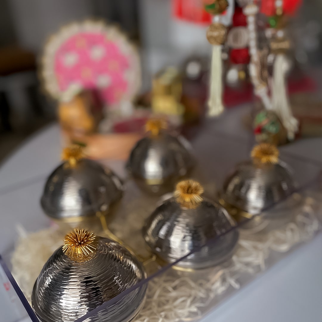 Toujour Delight is a gift forever! Izzhaar thoughtfully curated this dazzling gift hamper to infuse the joy of festivity into your celebrations! Mark the joyous occasion of Teej with our exquisite gift hamper, nestled in a plain transparent tray adorned with charming paper shreds, is a gift of delight. The five opulent silver jars, embellished with golden tufted knobs, steal the spotlight and add a touch of elegance to the presentation. Embrace the spirit of Teej with this heartfelt expression of affection and appreciation!