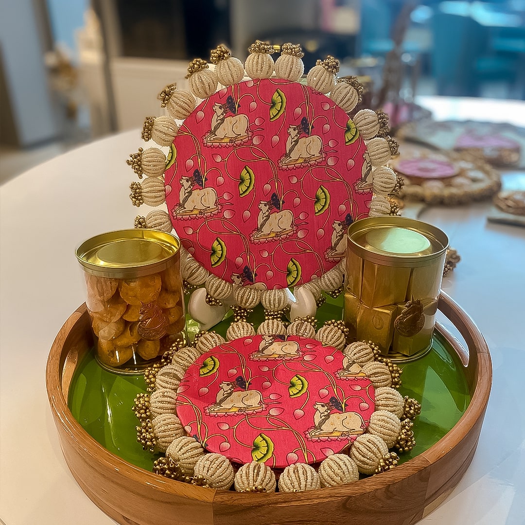 Grace the Teej festivity fervor with our exquisitely crafted Pichwai Platter hamper, the ultimate gift to celebrate the joyous occasion of Teej. This beautiful hamper is thoughtfully curated to bring together the essence of tradition and modernity, making it the perfect present for your loved ones. At the heart of the Pichwai Platter lies a rustic wooden round tray with a captivating enamel glaze, providing an enchanting backdrop for the artistry that awaits. package.