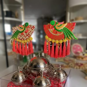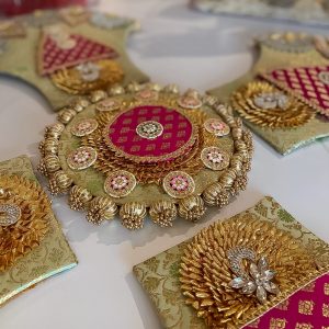 The silk embroidered fabric handcrafted with beautiful beads, pearls, and tassels, our exquisite masterpiece – the Zardozi Rangoli is an alluring fusion of artistry and elegance! Adorn your celebration spot with the epitome of beauty, and add a touch of opulence! Indulge in the timeless appeal of Zardozi’s work, intricately woven golden threads, creating a regal fabric of shimmering beauty. Fabric beads accentuate the design, adding a delightful texture to this enchanting creation. Prepare to be captivated as tiny pearl strings cascade gracefully, lending an ethereal charm to the floor Rangoli.