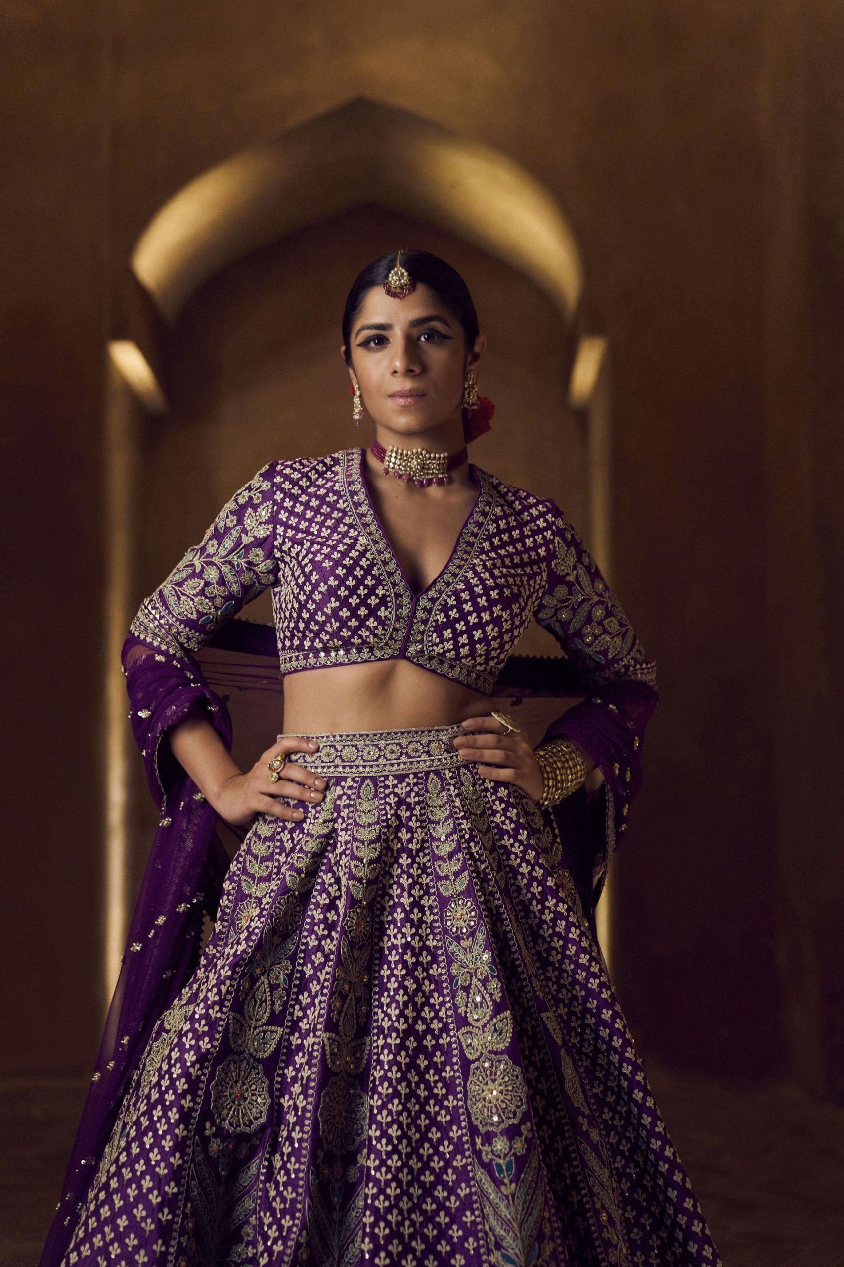 ‘Homage’ spotlights alchemical shapes and patterns that transcend time. The juxtapositioned curves of architecture and their linear historic ruin are brought to life by Serena Jethmalani, a young lawyer whose passion lies in the intersection of law and human rights. The geometry and play of colour on ancient tiles are modeled by Tiana Taraporvala who uses music as a medium to make people feel an emotional catharsis through her stories. Etchings that tell forgotten but distinct stories shine in the light of Sara Tendulkar who has a deep passion for research in the biosciences. With her organisational skills and intuitive mind, she has contributed in the development of skincare products with an international company. Rhea Kuruvilla who recognises how the industry of art is heavily dominated by men, has made it her mission to advocate harder for female-identifying South Asian artists, curators, and critics- it is her energy that brings the pieces in this collection inspired by tangible reminders of lives past- the documented and undocumented to the present. Alaviaa Jaaferi, a fashion influencer, and entrepreneur lends her charm to highlight the transience of time- in architecture and human will. In each piece photographed the woman featured has chosen elements to customise her lehenga and make it her own– a service long cherished by Anita Dongre brides.