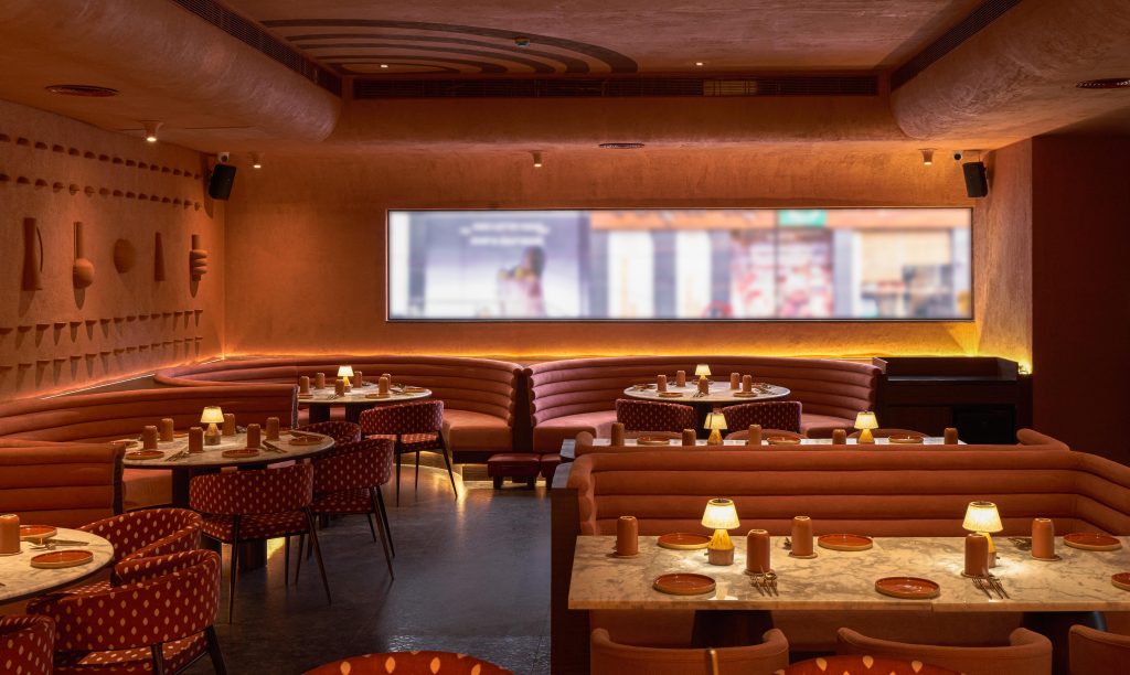 Paying homage to the celebratory structures in Jaipur, the space designed by The Purple Ink Studio, is enshrouded in a semi-transparent layer, subtly reflecting the vibrant hues and intricate details of the city’s heritage. The dining spaces are divided into two levels with fine dining at the lower level encompassing a culinary journey. The monolithic monotone walls are planned to be the main protagonist elevating the dining experience and creating a sense of intimacy. The subdued colour palette allows the focus to remain on the artistry of the cuisine. The textures are further enhanced by wall Frescoes and art adding a window into the cultural narrative.