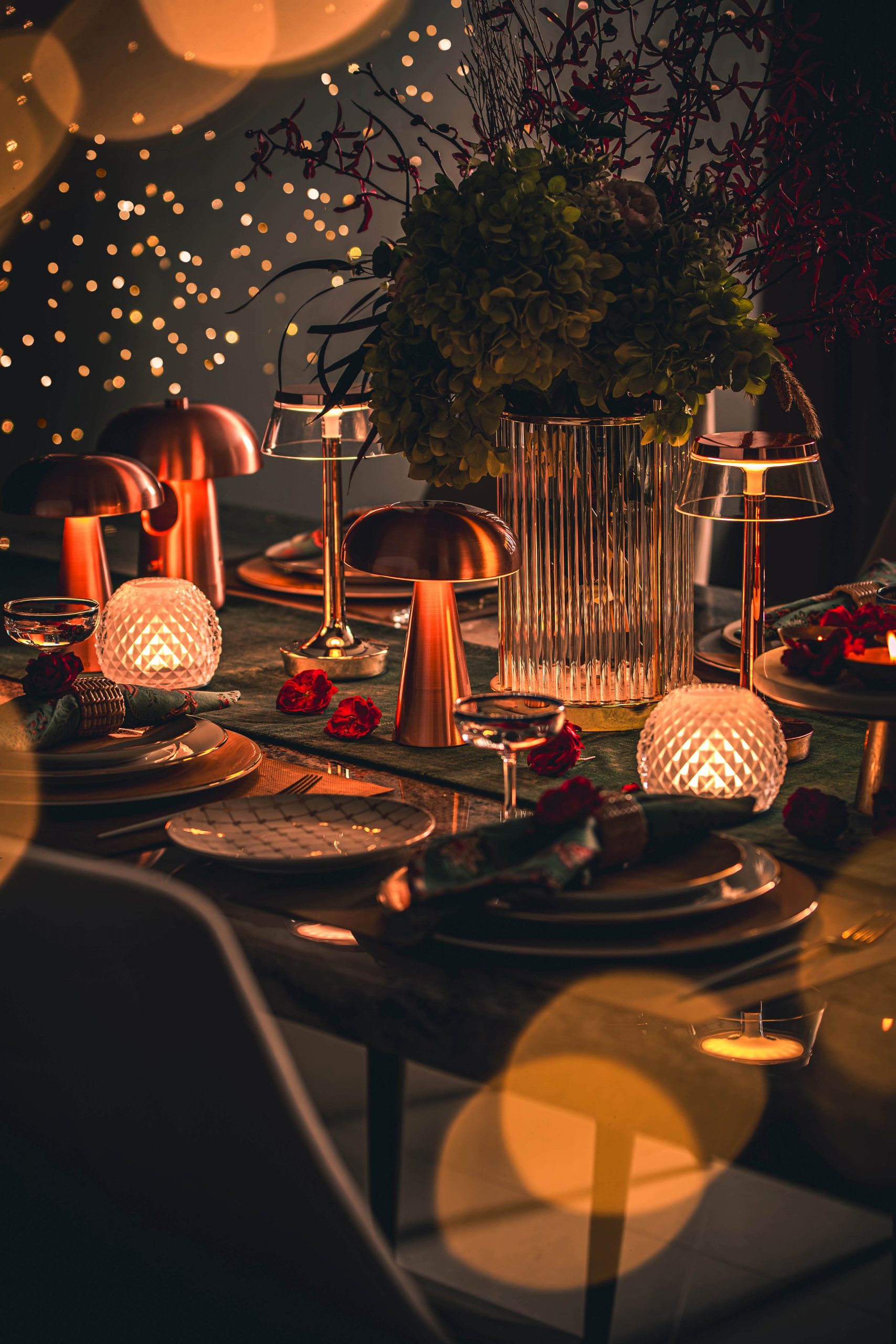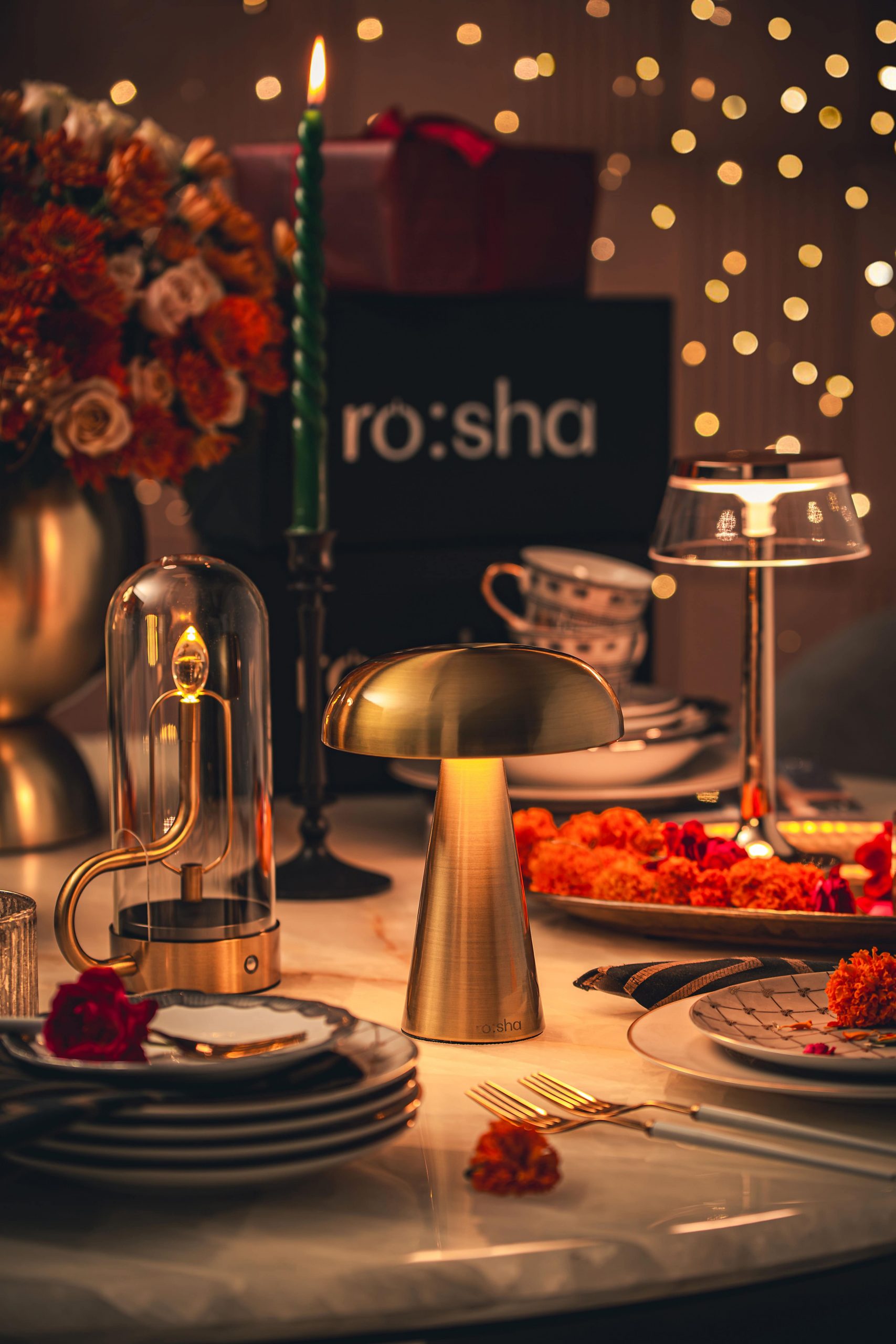 Crafted with a blend of unique shapes and a minimalist design, Rosha’s lamps are a true embodiment of contemporary luxury. With its portable, wireless lamps that effortlessly complement any table setting, Rosha lamps add a fuss-free yet elegant touch to your festive table set ups creating an exquisite ambiance.