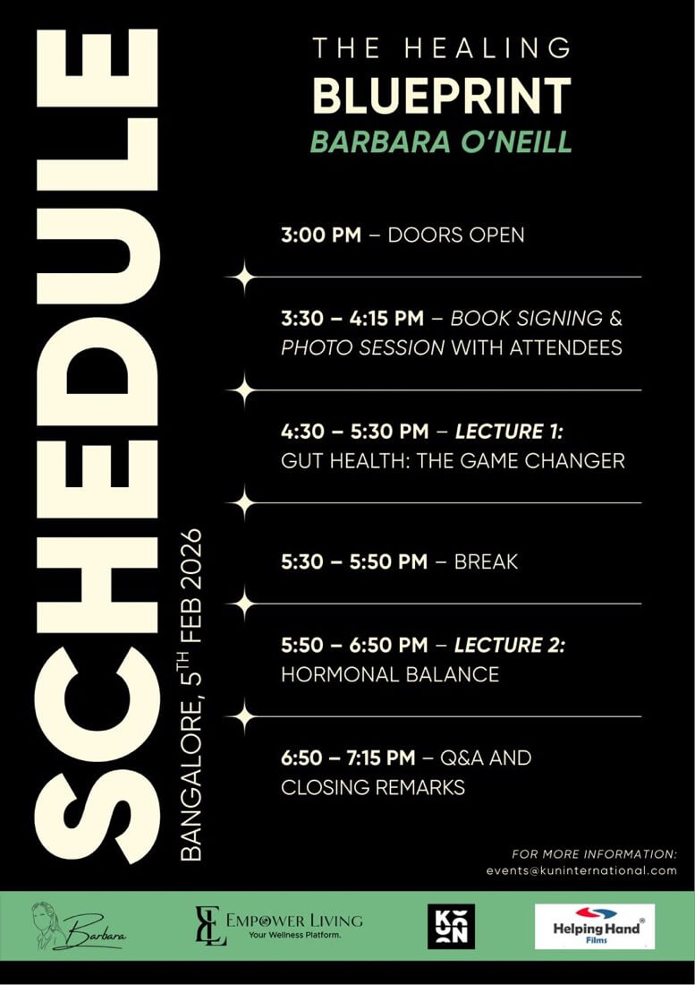 With over four decades of experience in natural health education, Barbara O’Neill has inspired millions worldwide through her practical, science-backed approach to holistic living. Her Bangalore session promises to be a transformative experience, focusing on the body’s innate ability to heal when supported with the right conditions, nutrition and lifestyle choices.
