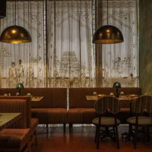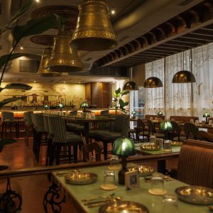 Spanning a total of 2000 square feet and 75 covers, Natural materials dominate the design, with polished wooden tables and woven cane chairs that invite guests to linger. Soft, ambient lighting that casts an inviting atmosphere with warm tones that enhances the dining experience. The interior adds a touch of nature and freshness, while exquisite antiques on the walls provide a gentle glow reminiscent of a coastal evening.