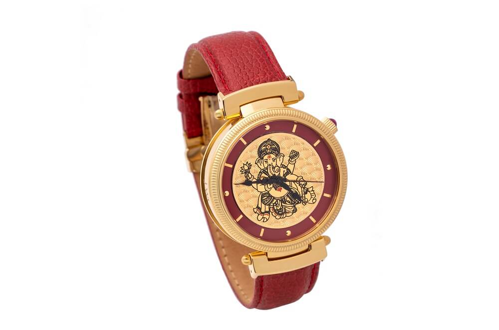 2. Then there is the “Ganesha Wristwear”, a one-of-a-kind, 100% hand-engraved timepiece that took our in-house artisans 2 and half months to create one perfect watch! The artistic metal inlay work coupled with the skeleton dial inspired by the “Jaali” design from Indian temples makes this watch a head-turner. The dial of the watch has been engraved in a manner that it reflects the roof and pillars of the temple with Lord Ganesh sitting on a lotus at the center. The 46 mm, Automatic 8215 Citizen Miyota watch comes with a power reserve of 50 hours, a sapphire crystal front and back, hand-made butterfly clasp leather straps and “ruby” placed as the crown.