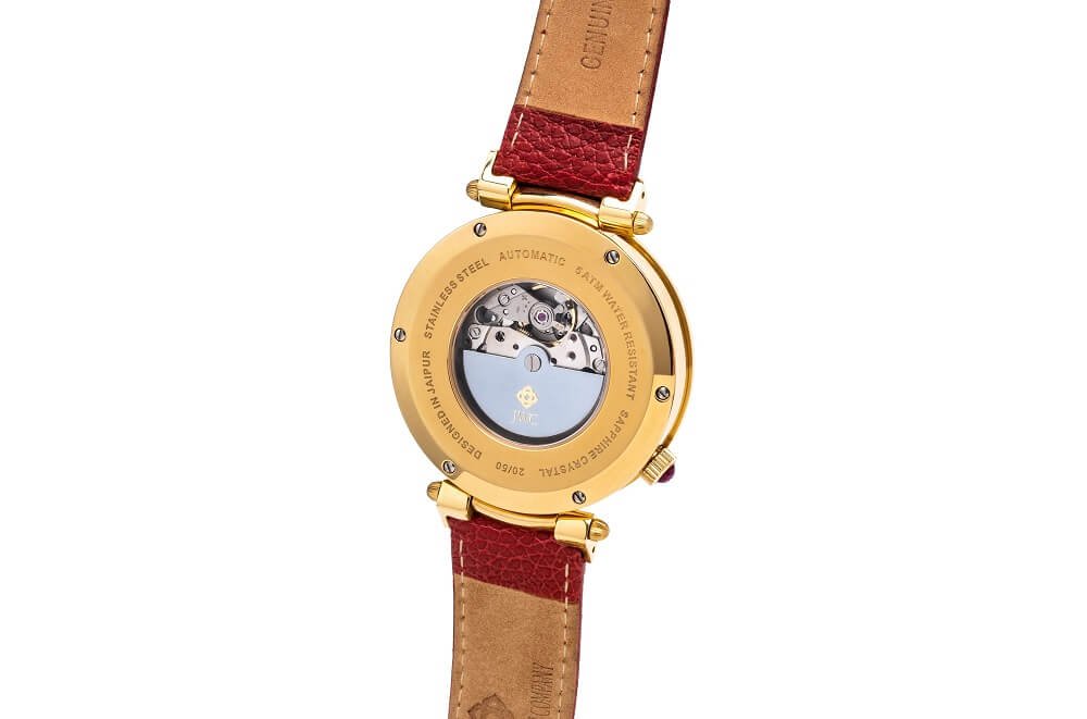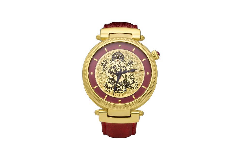 2. Then there is the “Ganesha Wristwear”, a one-of-a-kind, 100% hand-engraved timepiece that took our in-house artisans 2 and half months to create one perfect watch! The artistic metal inlay work coupled with the skeleton dial inspired by the “Jaali” design from Indian temples makes this watch a head-turner. The dial of the watch has been engraved in a manner that it reflects the roof and pillars of the temple with Lord Ganesh sitting on a lotus at the center. The 46 mm, Automatic 8215 Citizen Miyota watch comes with a power reserve of 50 hours, a sapphire crystal front and back, hand-made butterfly clasp leather straps and “ruby” placed as the crown.