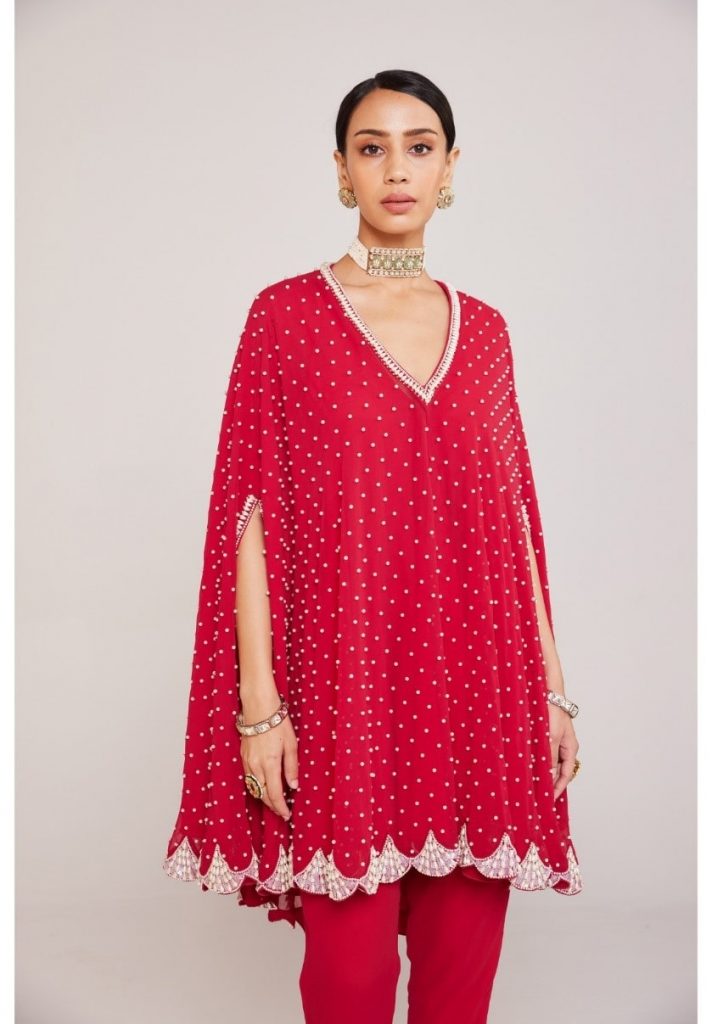 This gorgeous crimson red asymmetrical cape set is what a dream outfit looks like. A contemporary silhouette perfectly embellished with some pretty pearl detailing is sure to kickstart the wedding drama. Crafted with georgette fabric and enhanced with multiple white pearls placed aesthetically all over the cape and borders.